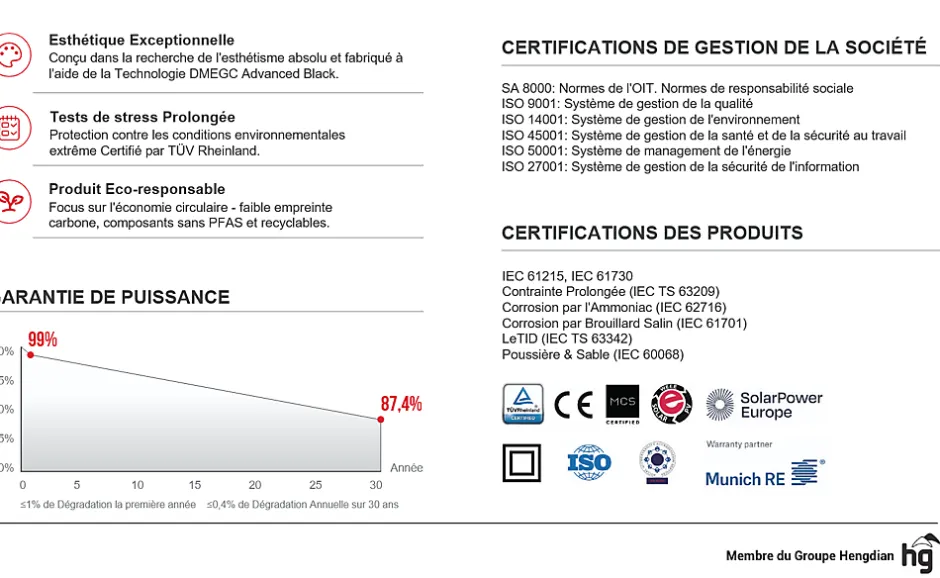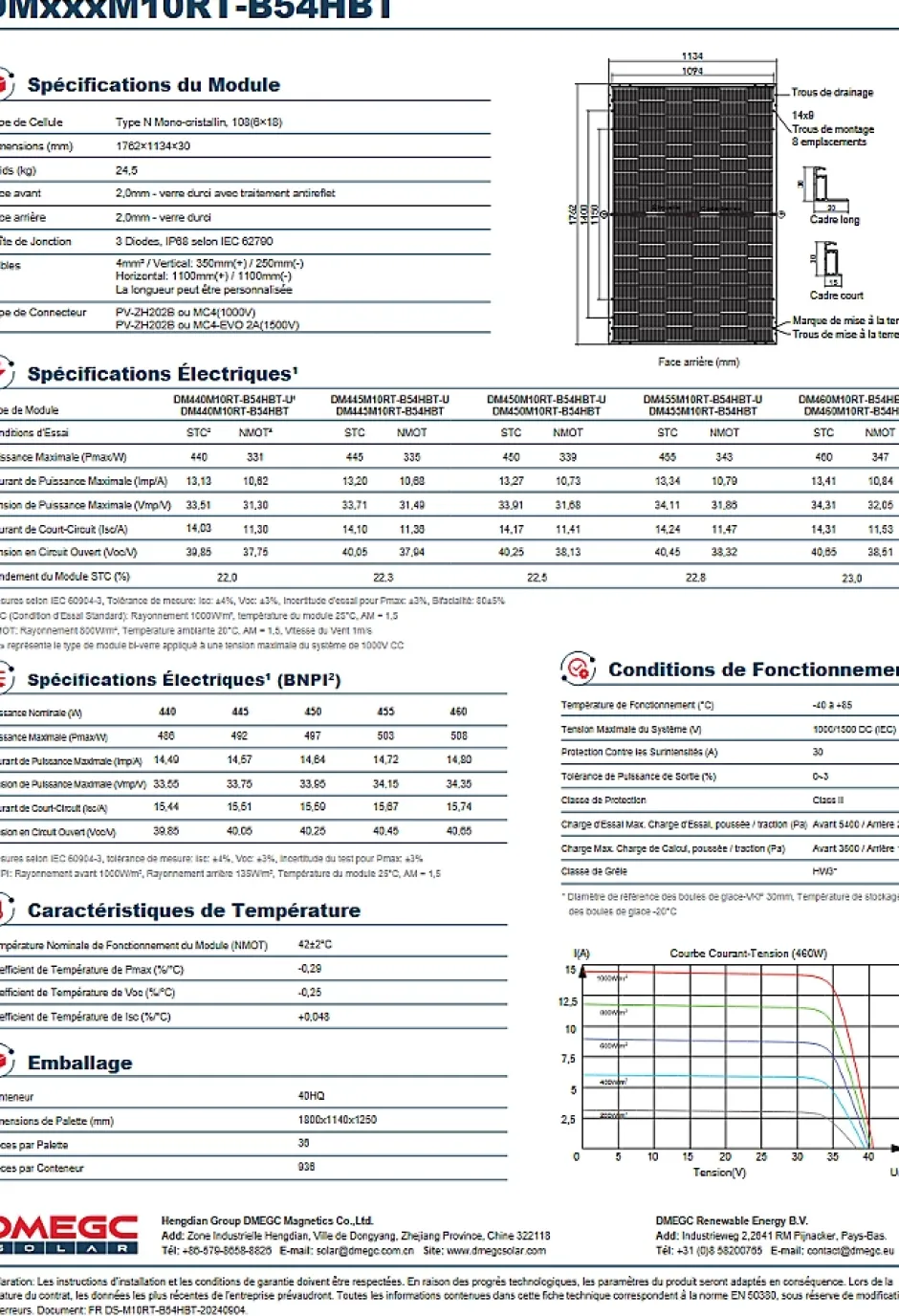 Avantages des panneaux DMEGC 450Wc Bifacial : Technologie bifaciale pour une production d’énergie jusqu’à +30% supérieure. Haute puissance et rendement pour installations résidentielles ou kits solaires. Robustesse : résistance au vent, à la neige et aux brouillards salins. Boîte de jonction IP68 et verre trempé 2 mm pour durabilité et sécurité. Cellules monocristallines Type N pour performance stable et faible dégradation. Installation polyvalente sur toiture, pergola, kit balcon ou au sol. Certifications internationales IEC 61215 / IEC 61730 et validation TÜV Rheinland. Garantie produit 25 ans et performance 30 ans (≥87,4%).