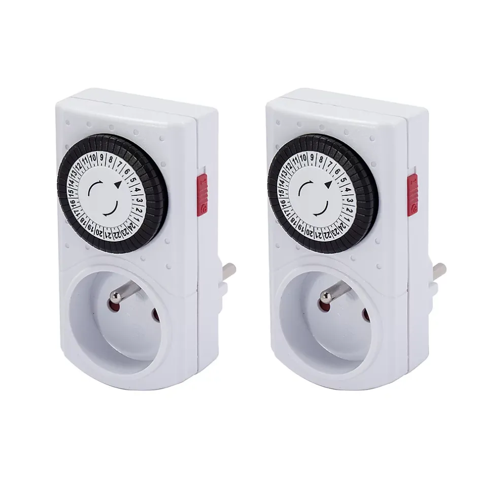 Programmateur mécanique. Couleur(s) : blanc. Programmateur mécanique. Type de prise : FR. Puissance maximale : 3500 W. Alimentation : prise secteur. Nombre de programmes : 24 cycles marche/arrêt par jour. Durée minimale par cycle : 30 minutes. Mode de réglage : curseurs à enfoncer. Interrupteur de service sur le côté. Utilisation intérieure uniquement