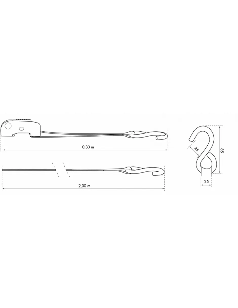 Sangle polyester 25mm x 2,00m à boucle autobloquante avec crochets S caoutchoutés.