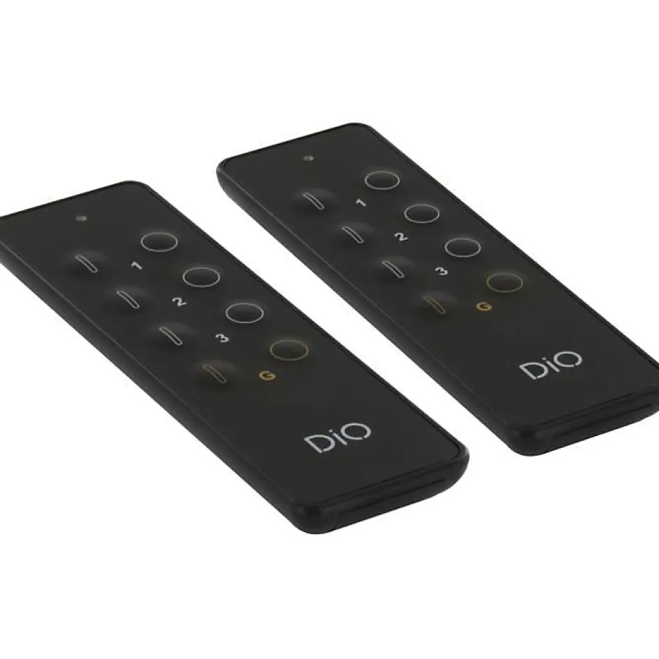Lot de 2 télécommandes DiO Connected Home 3 canaux + 1 groupe. Télécommande ultra plate en PVC noire pour piloter lampes, volets, prises et porte de garage à distance. Mode dimmer et pénétration du signal à travers les murs. Compatible avec la gamme DiO.