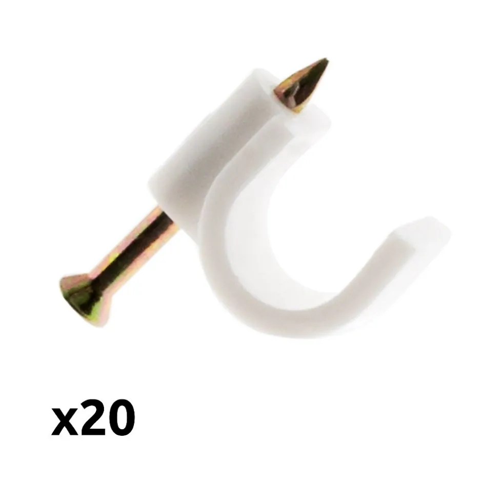 Lot de 20 attache clips ou crochets de fixation. Couleur(s) : blanc ou gris. Différents diamètres au choix. Avec clou spécial béton. Ces crochets permettent de fixer des câbles et autres gaines au mur. Convient particulièrement aux câbles TV. Norme(s) : CE