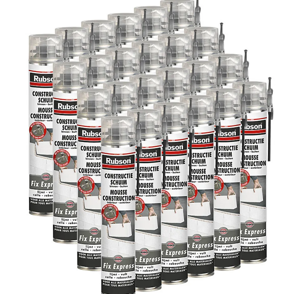 La Mousse Construction Fix Express RUBSON est une mousse expansive polyuréthane mono-composante à faible expansion , idéale pour la fixation, le montage et la pose d’éléments de construction . Conditionnée en lot de 24 aérosols de 750 ml , cette mousse professionnelle garantit une application rapide, précise et durable, aussi bien en intérieur qu’en extérieur . Une mousse de construction haute performance Conçue pour les travaux de montage, de collage et d’isolation , la mousse Rubson Fix Express offre une adhérence exceptionnelle sur la plupart des matériaux utilisés en construction. Compatible avec le bois, le métal, les plaques de plâtre, le béton cellulaire, la brique, la pierre, les isolants, le ciment, les panneaux de fibres ou encore le PVC rigide , elle s’adapte à une large gamme d’applications.Sa formule à faible expansion empêche toute déformation des matériaux collés et garantit un assemblage propre et stable . Elle peut être utilisée avec ou sans pistolet , offrant ainsi une grande souplesse d’emploi selon vos besoins sur chantier. Fixation rapide et résistance optimale La mousse Rubson Construction Fix Express se distingue par sa prise rapide et sa forte résistance mécanique .○ Temps de séchage en surface : environ 10 minutes○ Durcissement complet : 1 heure minimumUne fois durcie, la mousse peut être coupée, sciée, poncée et peinte , permettant une finition nette et soignée.Elle reste résistante à l’humidité, aux variations de température et au vieillissement , garantissant une tenue durable dans le temps .