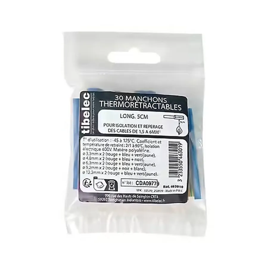 AvantagesLe lot de 30 manchons thermorétractables TIBELEC permet d’assurer une isolation fiable et un repérage efficace des câbles électriques de 1,5 à 6 mm². Conçus pour une utilisation dans des conditions extrêmes, ils résistent à des températures comprises entre -55 °C et 135 °C. Leur mise en œuvre est simple et rapide, garantissant une protection durable des connexions électriques.CaractéristiquesType de produit : manchons thermorétractables. Marque : TIBELEC. Quantité : lot de 30 pièces. Fonction : isolation et repérage des câbles. Section de câbles compatible : de 1,5 à 6 mm². Longueur unitaire : 5 cm. Plage de température d’utilisation : de -55 °C à 135 °C. Dimensions du produit déballé : hauteur 3 cm, largeur 7 cm, profondeur 12 cm. Poids du produit déballé : 0,016 kg.Accessoires inclusLot de 30 manchons thermorétractables.Informations complémentairesGarantie commerciale : 60 mois. Disponibilité des pièces détachées : non communiquée. Dimensions du produit emballé : hauteur 24 cm, largeur 8,5 cm, profondeur 4 cm. Poids du produit emballé : 0,023 kg. Références produit : 25005558 / 3233550463019.