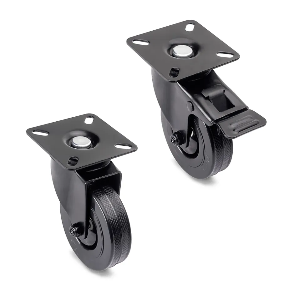 Set de 4 roulettes pour meuble: 2 roulettes avec frein et 2 roulettes sans frein.Diamètre de la roulette: 75 mm.Monture en tôle acier zinguée et bandage de roulement en caoutchouc noir.Platine à visser au meuble (vis de montage compris).PCapacité de charge de 40 kg par roulette. VOIR LES MESURES DU PRODUIT DANS LES IMAGES. Roulettes noires avec plétine de montage idéales pour tous les meubles de la maison et du bureau, pour caissons à tiroirs, ainsi que pour les chambres d’enfants.Chaque kit contient 2 roulettes avec frein, 2 roulettes sans frein et les vis de montage.De facile installation, ces roulettes permettent d’optimiser et améliorer vos meubles grâce à leur roulements à billes, chi fournit un glissement doux et silencieux.