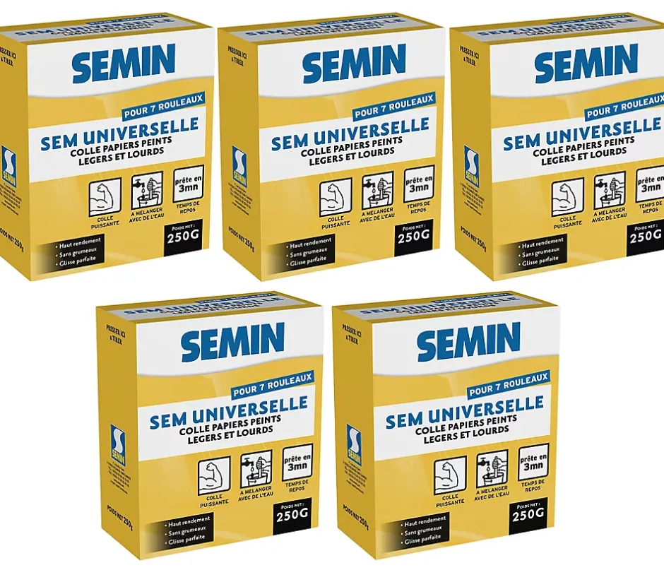 COLLE IDÉALE POUR TOUS LES PAPIERS PEINTS STANDARDS – POUR 7 ROULEAUXLa colle à papier peint s’adapte à tous les types de papiers peints standards (courants, épais…) et sur de nombreux supports : plaques de plâtre, carreaux de plâtre, béton ou enduit ciment et plâtre.Ce pack contient :Colle papiers peints, 5 boites de 250 gLES AVANTAGES DE LA COLLE A PAPIER PEINTLa colle à papier peint en poudre présente de nombreux avantages pour vos travaux :• Un produit idéal pour tous les types de papiers peints ;• Une colle à papier peint prête en 3 minutes ;• Un aspect transparent après séchage ;• Une pâte sans grumeaux ;• Un haut rendement ;• Une glisse parfaite.Facilité et rapidité d’homogénéisation ainsi que sa glisse exceptionnelle lui confèrent une mise en œuvre aisée.CARACTÉRISTIQUES TECHNIQUESPoids : Boite de 250 gRendement : 7 rouleauxPréparation : 7 à 7,5 litres d’eau froideUsage : Intérieur – murs et plafonds