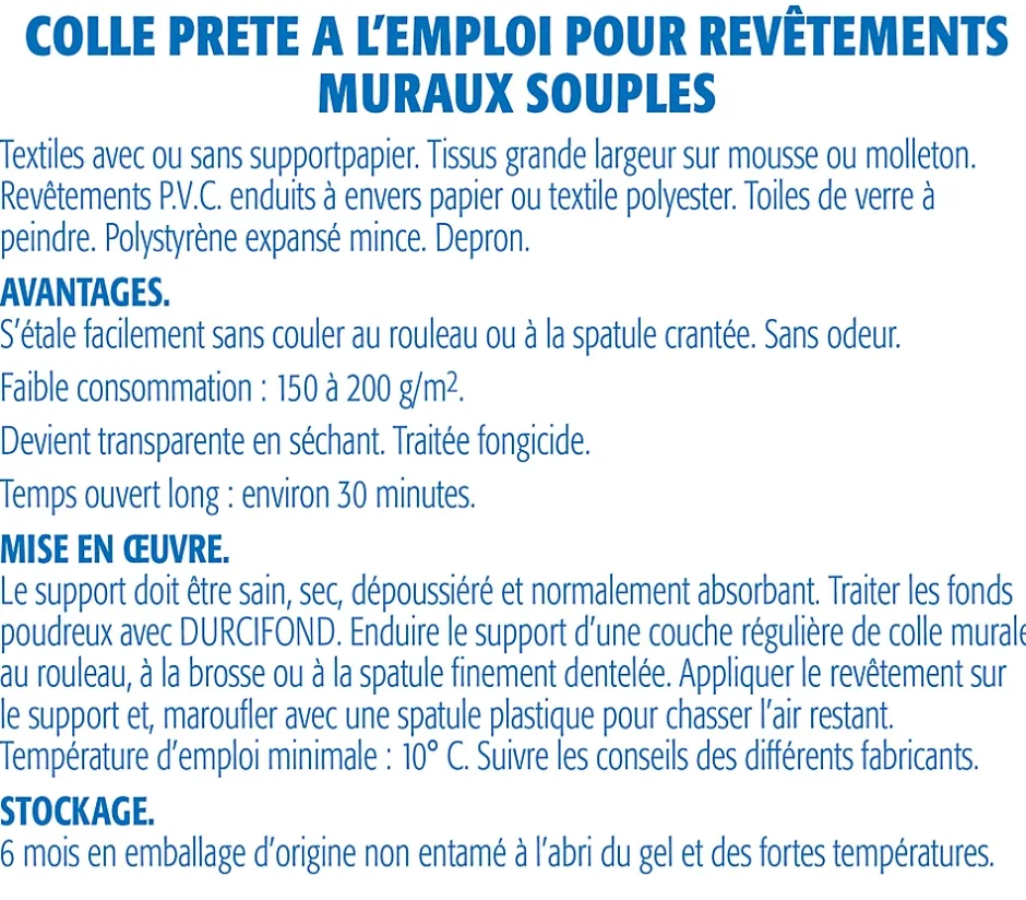 - Colle prête à l’emploi pour papiers peints légers et toiles de verre | Conçue pour tous les revêtements muraux souples, même en milieu humide : toile de verre, textiles, PVC enduit, polystyrène expansé, Depron, etc.