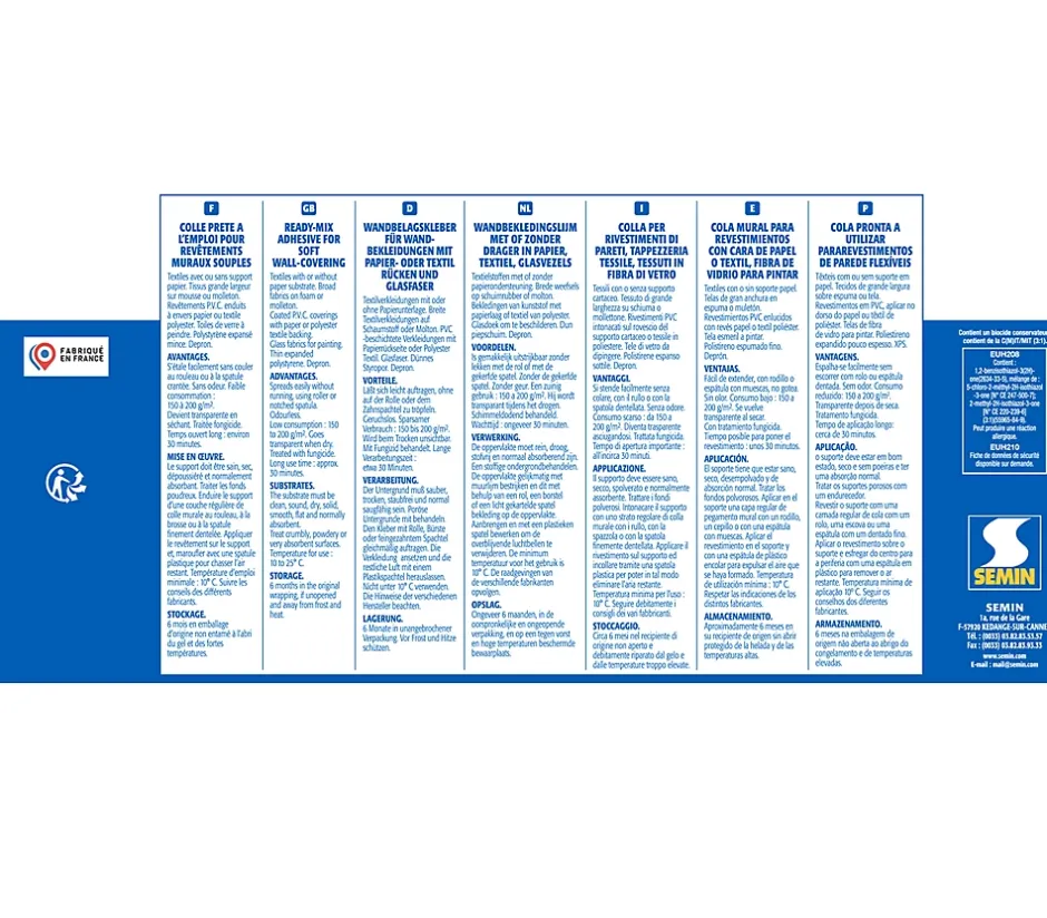 COLLE POUR REVÊTEMENTS MURAUX LÉGERS ET TOILES DE VERREColler-résine en émulsion prête à l’emploi, SEM-MURALE convient pour la mise en œuvre de tous les revêtements muraux souples, ainsi que pour le collage de la toile de verre, même en milieu humide.Ce pack contient :• Colle pour Toiles de Verre et Revêtements Muraux Légers Semin Sem Murale, 5 seaux de 5 kgLES AVANTAGES DE LA COLLE TOILE DE VERREOn utilise volontiers la colle pour toile de verre car elle possède de nombreux avantages pour vos supports d’intérieur :• L’absence de solvant ;• Un produit sans odeur ;• Une faible consommation ;• Une forte adhérence ;• Une très belle qualité ;• Une grande facilité d’application ;• Une colle fabriquée en France.Utilisable en intérieur sur murs et plafonds1/ L’application se fait par simple encollage du support à l’aide d’un rouleau, d’une brosse ou d’une spatule crantée.2/ N’encoller qu’une surface correspondant au maximum à 2 lés. Afficher le lé et maroufler du centre vers la périphérie.3/ Nettoyer l’excédant de colle à l’aide d’une éponge.Nettoyage des outils à l’eau.SUPPORTS ADMISMurs et plafonds en intérieur :• Béton• Enduit ciment• Plaques de plâtre• Carreaux de plâtre• Sous-couche d’impressionREVÊTEMENTSTextiles avec ou sans support papier. Tissu grande largeur sur mousse ou molleton. Revêtements P.V.C. enduits à envers papier ou textile polyester. Toiles de verre à peindre. Polystyrène expansé mince. Depron.CARACTÉRISTIQUES TECHNIQUESDimensions du produit : 22.8 x 22.8 x 19.4 cmPoids : 5 kgCouleur : BlancMatière : Résine en émulsion, amidon, agent de rhéologie et divers adjuvantsConsommation : De 150 à 250 g /m²Temps de gommage : 5 à 10 mnTemps ouvert : 30 mnTemps de prise : 12 à 24 heuresStockage : 6 mois à l’abri du froid et des fortes chaleurs en emballage d’origine non entaméUsage : Intérieur – murs et plafonds