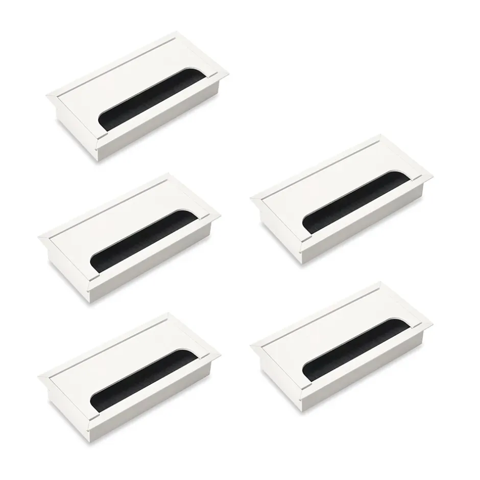 Passe-câbles rectangulaire à insérer dans la surface des bureaux, tables ou meubles de maison pour cacher les câbles des appareils électroniques.Il permet de faire passer des câbles de toute épaisseur et de cacher leurs connexions. Pour y accéder, il dispose d’un couvercle abattant et de brins en plastique noir.Pour son installation, il nécessite un usinage préalable de 147 x 68 mm. La fixation s’effectue par pression.Peut être monté sur des surfaces très épaisses.Fabriqué en Aluminium Peint en blanc. Chaque lot contient 5 passe-câbles. VOIR LES MESURES DU PRODUIT DANS LES IMAGES. Passe-câbles rectangulaire pour encastrer sur les bureaux ou les tables de travail fabriqué en aluminium. Il est compatible avec les câbles de toutes dimensions et dissimule leurs connexions facilement grâce à son couvercle rabattable.