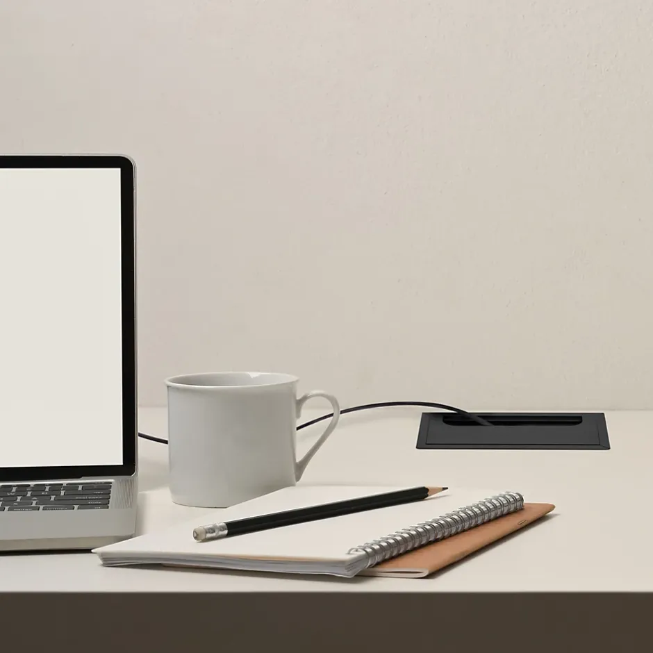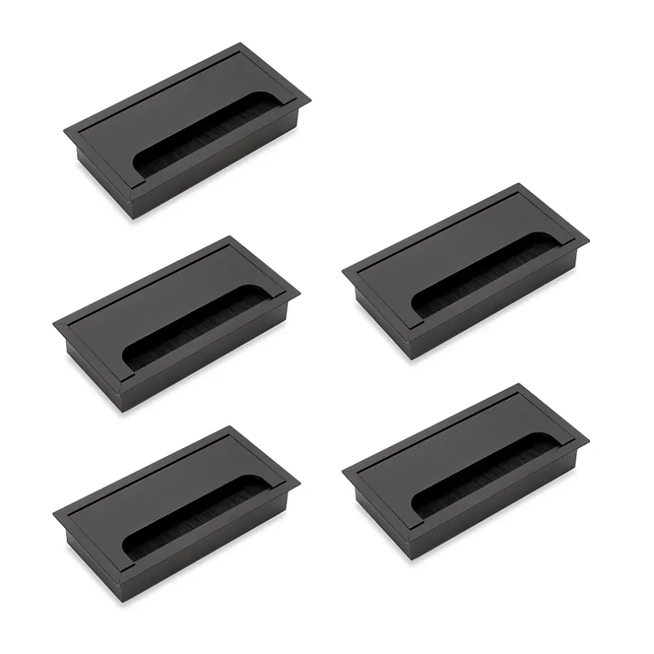 Passe-câbles rectangulaire à insérer dans la surface des bureaux, tables ou meubles de maison pour cacher les câbles des appareils électroniques.Il permet de faire passer des câbles de toute épaisseur et de cacher leurs connexions. Pour y accéder, il dispose d’un couvercle abattant et de brins en plastique noir.Pour son installation, il nécessite un usinage préalable de 147 x 68 mm. La fixation s’effectue par pression.Peut être monté sur des surfaces très épaisses.Fabriqué en Aluminium peint en noir. Chaque lot contient 5 passe-câbles. VOIR LES MESURES DU PRODUIT DANS LES IMAGES. Passe-câbles rectangulaire pour encastrer sur les bureaux ou les tables de travail fabriqué en aluminium. Il est compatible avec les câbles de toutes dimensions et dissimule leurs connexions facilement grâce à son couvercle rabattable.