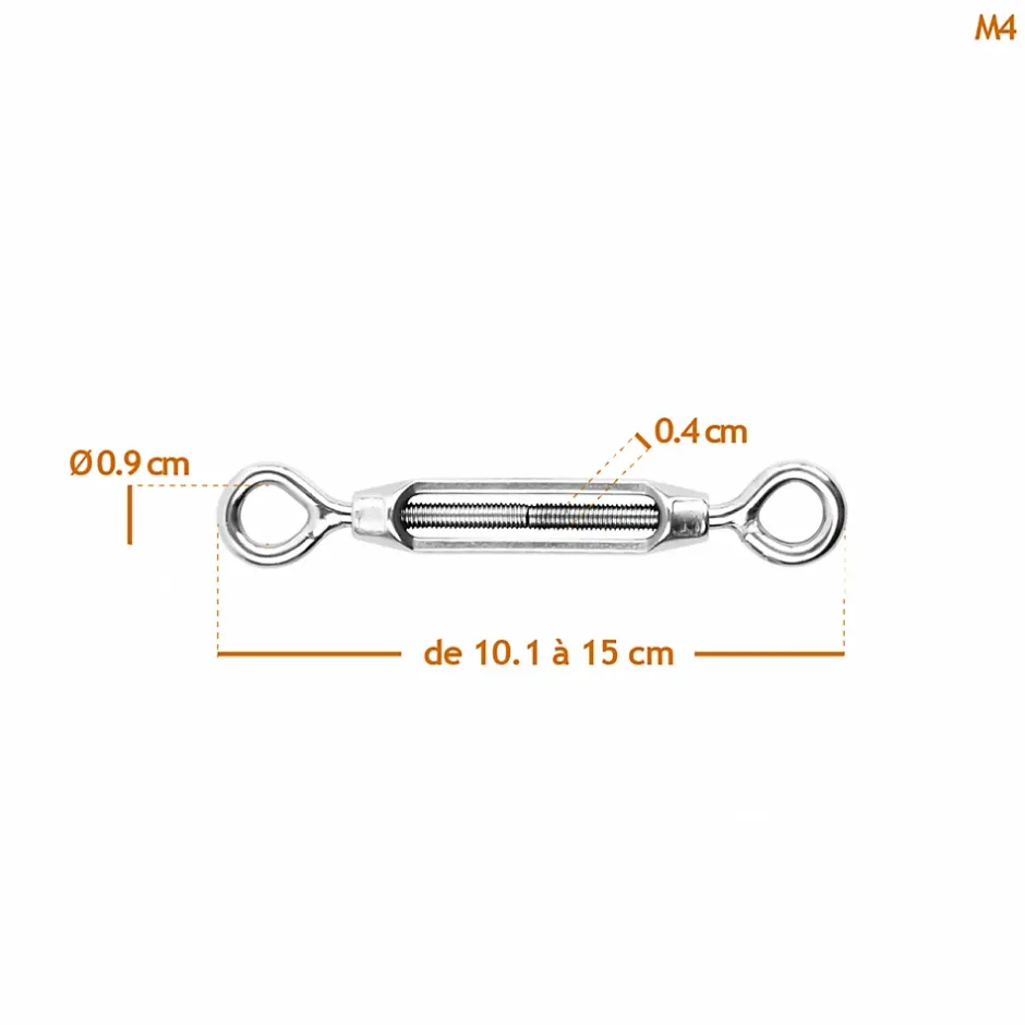 Fabriqué en acier inoxydable 304 de haute qualité, ce lot de tendeurs de fil en acier double oeillets Linxor est antirouille, résistant à la corrosion et durable dans le temps.Facile à installer, il suffit de dévisser le tendeur pour ajuster la tension selon votre utilisation. Un tendeur M4 peut supporter une force de 8.58 newtons ; 10,5 newtons pour le modèle M5 et 12,42 newtons pour le modèle M6.Idéal pour ajuster la tension ou la longueur des câbles, cordes, ou autres systèmes de tension. Vous pouvez utiliser ces tendeurs sur un câble de corde à linge, une chaîne, un garde-corps ou toute autre application intérieure comme extérieure.Un tendeur M4 double oeillets mesure de 10.1 cm à 15 cm de longueur avec un diamètre filetage de 0.4 cm et un diamètre intérieur oeillet de 0,9 cm.Un tendeur M5 double oeillets mesure de 12.2 cm à 17.5 cm de longueur avec un diamètre filetage de 0.4 cm et un diamètre intérieur oeillet de 0.9 cm.Un tendeur M6 double oeillets mesure de 15 cm à 21 cm de longueur avec un diamètre filetage de 0.6 cm et un diamètre intérieur oeillet de 1.1 cm.Disponibles en plusieurs lots, dimensions et formes de tendeurs.