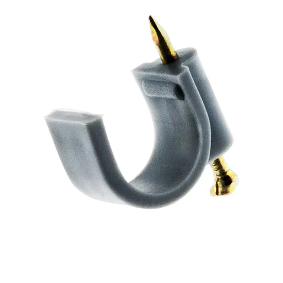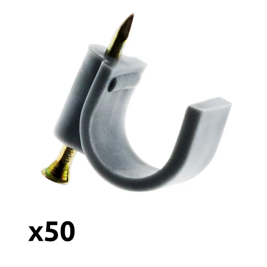 Lot de 50 crochets de fixation. Couleur(s) : gris ou blanc. Conçus pour des fils de Ø20mm de diamètre. Avec clou spécial béton. Parfaits pour fixer les câbles et gaines au mur. Norme(s) : CE