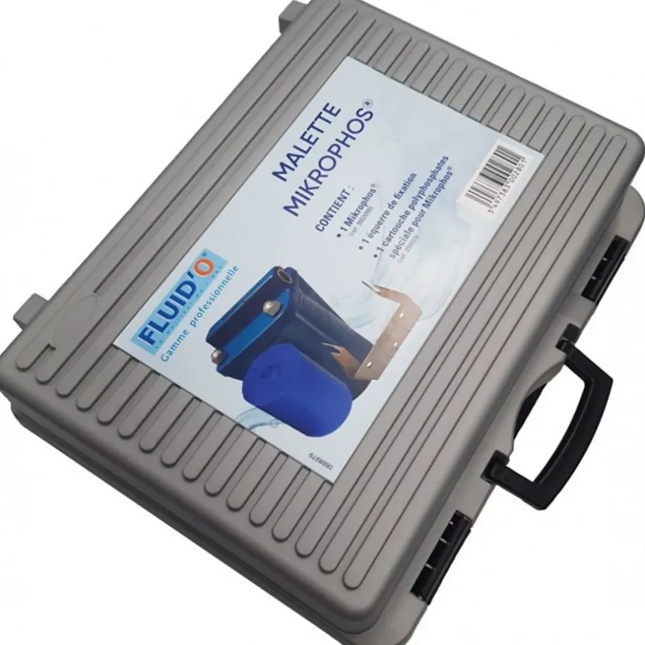 MIKROPHOS : La solution au tartre Malette complète pour lutter efficacement contre le calcaire = Anti-tartre MIKROPHOS 1 kg Corps en fonte grande résistance fourni avec sa cartouche de cristaux de polyphosphate et son support acier de fixation murale. Jour après jour le calcaire attaque et détruit les installations. Il entartre les canalisations d’eau, les appareils de production d’eau chaude, les circuits d’eau de conditionnement d’air. Il réduit les diamètres des conduites, provoque ainsi une chute du débit et les bruits de distribution.L’énergie est gaspillée par déperdition calorifique à travers la croûte isolante du calcaire.Les joints se détériorent et provoquent des fuites des chasses-d’eau, des robinets. Malette comprenant : – 1 MIKROPHOS 1 kg Série 3 (réf. 3002000) – 1 cartouche de rechange (réf. 350069) – 1 support de fixation murale acier pour station Mikrophos (réf. 300250) – malette plastique renforcée