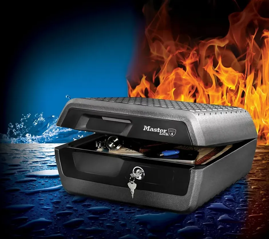 Le caisson de sécurité Master Lock LCFW30100 protège documents A4, supports média et objets de valeur contre le feu et l’eau. Construction résistante au feu certifiée UL/ETL (60 minutes, jusqu’à 927 °C) et étanchéité homologuée ETL pour immersion. Serrure à clé avec 2 clés incluses, capacité 10 L, intérieur adapté aux documents A4, finition gris neutre.