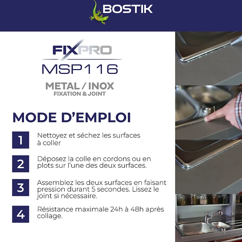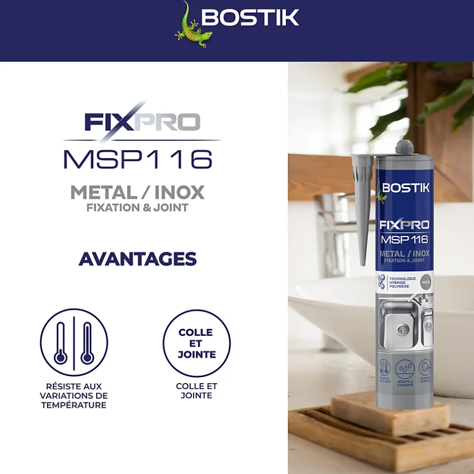 Bostik Fixpro MSP 116 métal et inox est une colle de fixation et d’étanchéité idéale pour les métaux et autres matériaux.