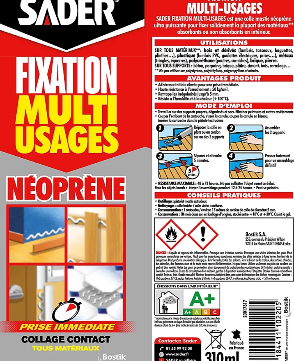 Mastic de Fixation Sader Multi-Usages Néoprène Cartouche 310 ml – Tous supports, Résiste à l’humidité et à la chaleur. A l’achat de ce produit en magasin, un contrôle d’identité pourrait être opéré, conformément à la réglementation en vigueur.
