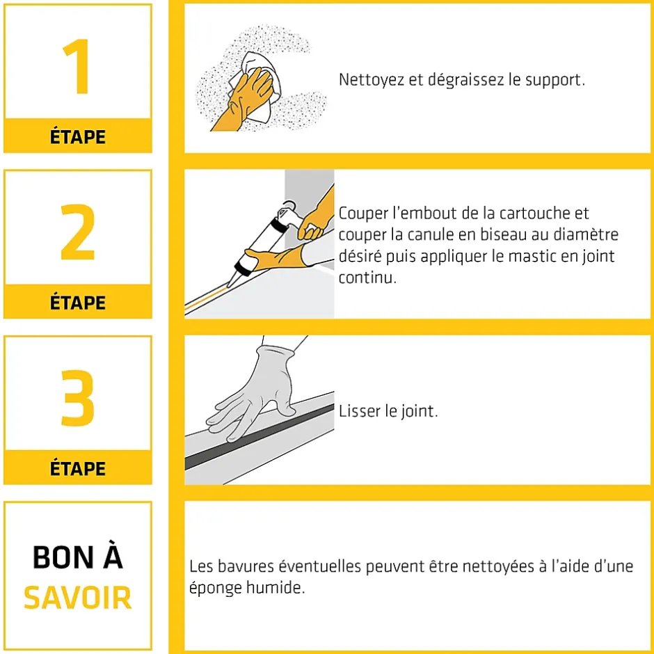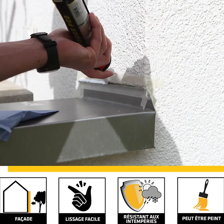 - Avantages : S’applique et se lisse facilement. Bonne adhérence sur les supports tels que le bois et le béton et de nombreux supports utilisés en construction. Haute durabilité : étanche à l’eau et à l’air, résiste aux intempéries, au vieillissement et aux U.V. Souple. Capacité totale de mouvement de 12,5 %. Ne flue pas. Faible odeur. Peut être peint (essais préalables)