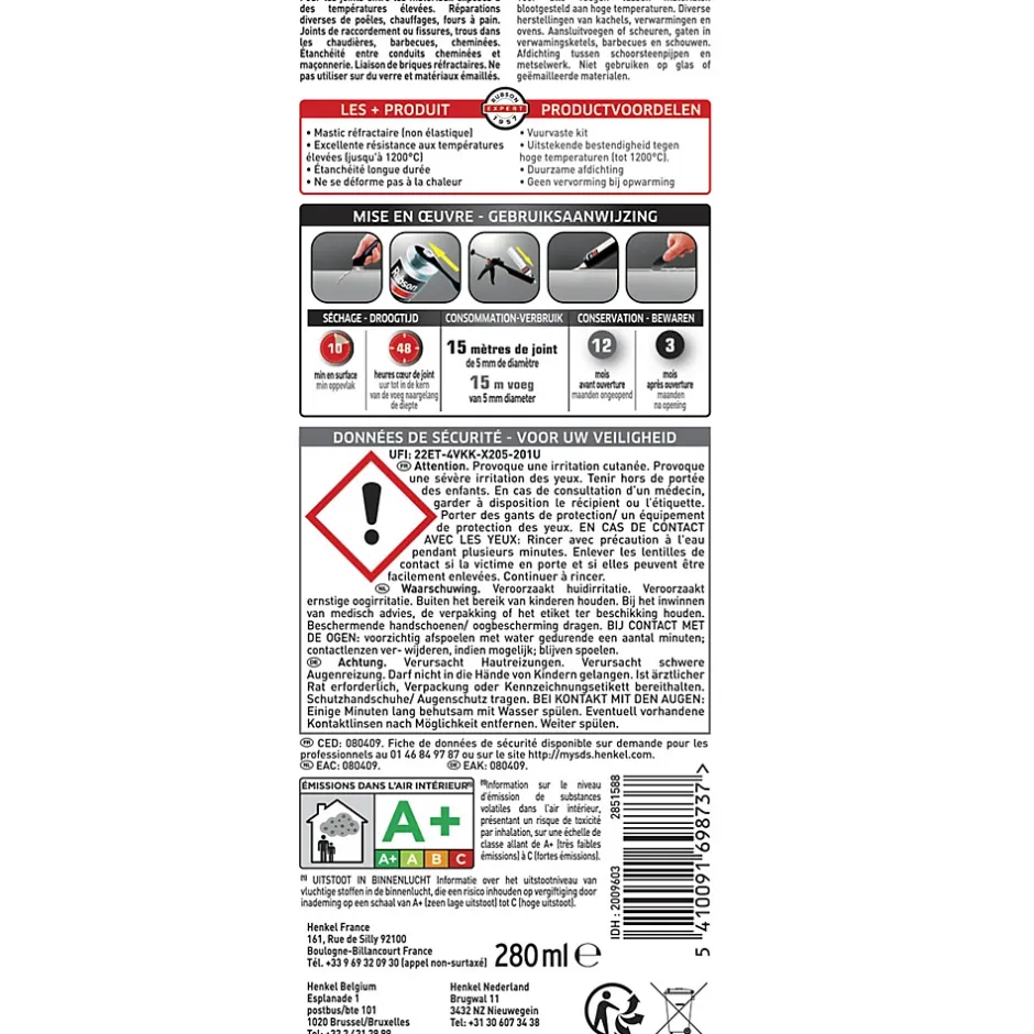 Le Mastic Hautes Températures RUBSON est un mastic à base de polymère silicate durcissant au contact de l’air (réfractaire non élastique). Il est idéal pour les joints entre matériaux exposés à des températures élevées : Réparations diverses de poêles, chauffages, fours à pain. Il s’utilise pour les joints de raccordement ou fissures, trous dans les chaudières, barbecues, cheminées. Ce produit propose une étanchéité entre conduits de cheminée et maçonnerie. Il est également utilisé pour les liaisons de briques réfractaires. Ne pas utiliser sur verre et matériaux émaillés. Il bénéficie d’une excellente résistance aux températures élevées (jusqu’à 1200°C) et ne se déforme pas à la chaleur.
