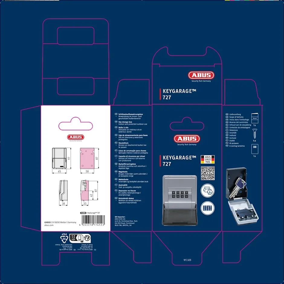 - La mini-boîte à clés KeyGarage™ 727 peut être montée au mur et peut contenir jusqu’à huit clés.