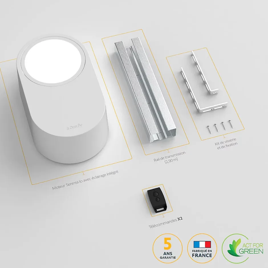 - Ce kit contient 1 moteur Serenia® 700 radio io, 1 rail en acier galvanisé en 3 parties, 2 télécommandes Keytis, 1 bras de liaison, 2 supports (pour linteau/porte), et 1 sachet de visserie.