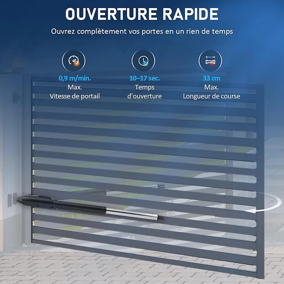 KIT DE MOTORISATION POUR PORTAIL : Grâce aux moteurs électriques 80W à haut rendement énergétique, ces deux automatismes pour portails battants gèrent facilement jusqu’à 2,5 mètres et 300 kilogrammes ; profitez d’une utilisation sûre et pratique grâce aux démarrages et arrêts progressifs personnalisables et aux multiples modes de fonctionnement de nos automatismes.CONSTRUCTION DE HAUTE QUALITÉ : Notre ensemble de 2 actionneurs linéaires de portail électrique est composé d’un alliage d’aluminium durable qui les rend légers et robustes, tandis que les couvercles en ABS évacuent rapidement la chaleur en travaillant ensemble avec des moteurs en cuivre très efficaces pour fournir des années de service fiable.CONTRÔLE PAR TÉLÉCOMMANDE : Cet automatisme d’ouverture et de fermeture de portails est livré avec 2 télécommandes, permettant d’ouvrir votre propriété à une distance de près de 30 mètres sur simple pression d’un bouton ; le système prend en charge jusqu’à 25 télécommandes supplémentaires, répondant ainsi aux besoins des familles nombreuses, des petites communautés, des entreprises, des écoles et bien plus encore.