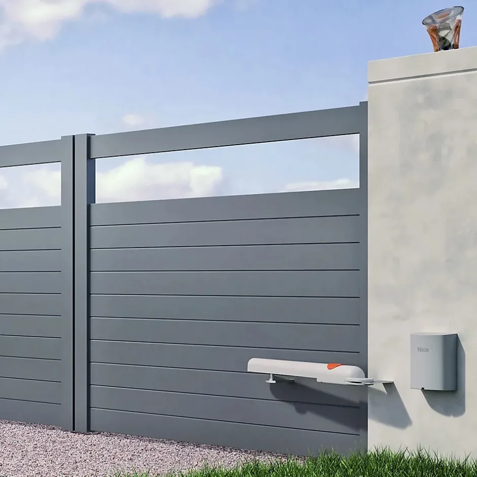 - Kit complet pour portail battant incluant 2 moteurs NICE ARIA200M, une centrale NICE CLB202 et 2 télécommandes NICE ECCO5BO.