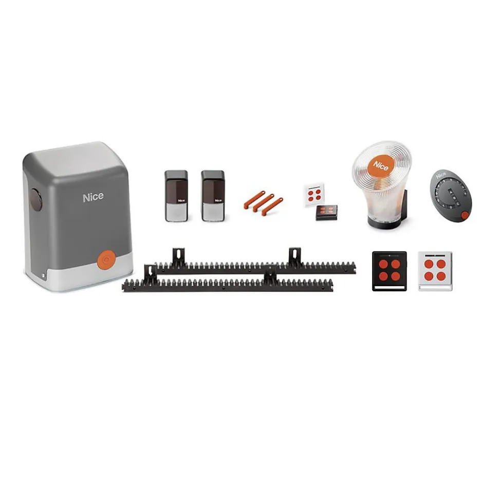 - Kit comprenant : 1 moteurs FILO400C + CR502 avec récepteur intégré et logique de commande, 2 Télécommandes 4 touches 433.92MHz de modèle HOME ECCO5, Une crémaillère de 4m en nylon, Une paire de photocellule orientable PH200, 1 lampe LED clignotante et orientable avec antenne intégrée FL200 et Trois clés de débrayage pour ouvrir le portail en cas de coupure de courant