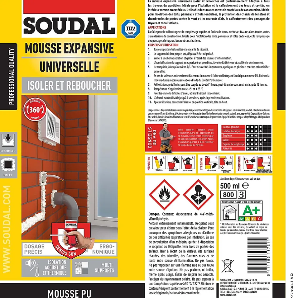 Mousse expansive Soudal Isoler et reboucher 360 500ml