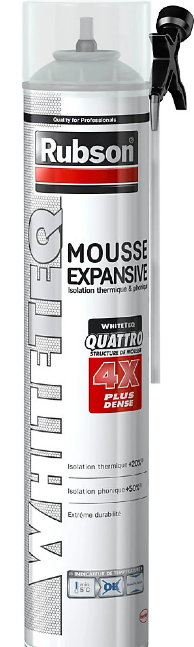 La mousse expansive polyuréthane WhiteTeq est un isolant thermique et phonique qui a été développée pour isoler les fenêtres et portes, calfeutrer des ouvertures dans les constructions de toit et des matériaux d’isolation, créer des écrans insonorisés, isoler des murs et toitures, et remplir des cavités. Elle fait partie d’une nouvelle génération de mousse de polymères blancs composée d’éléments purs et concentrés. La purification des polymères donne à la mousse WhiteTeq sa structure Quattro exceptionnelle avec 4 fois plus de cellules/cm3, sa couleur blanche caractéristique, et jusqu’à 10 fois plus de résistance aux UV pour une isolation plus durable. Elle est applicable sur la plupart des matériaux de construction: bois, béton, fibre-ciment, plâtre, métal… à l’exception du polyéthylène et du téflon. Un indicateur de température est situé sur le devant de l’aérosol. Lorsque la température de l’aérosol est inférieure à +5°C, un flocon de neige bleu apparaît et l’aérosol et son contenu doivent être réchauffés dans une pièce chauffée ou dans de l’eau chaude.