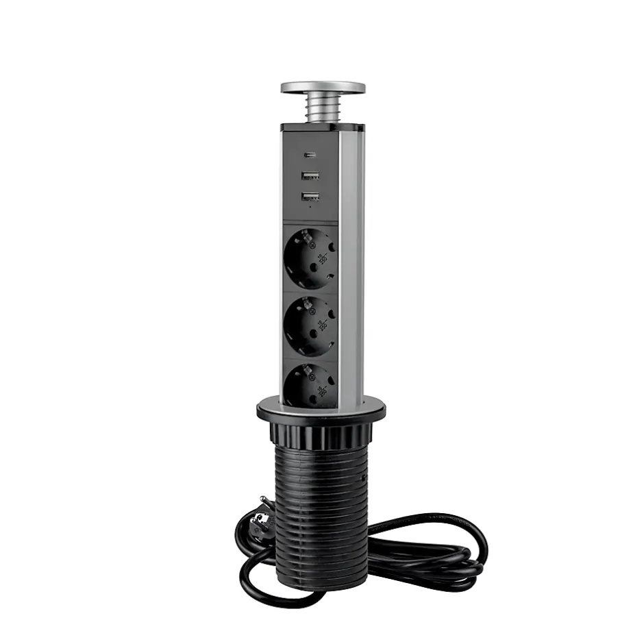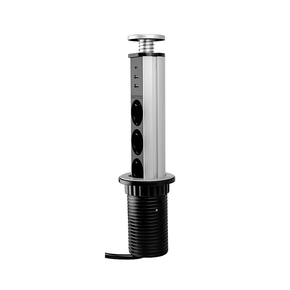 Multi-connecteur ou tour multiprises élévable avec 3 prises Schuko, 2 connecteurs USB A et USB C, charge rapide, installation facile et design escamotable, idéal pour cuisine, bureau et maison.