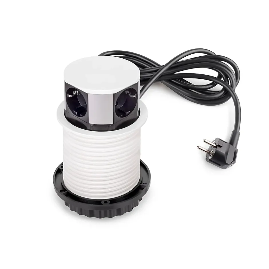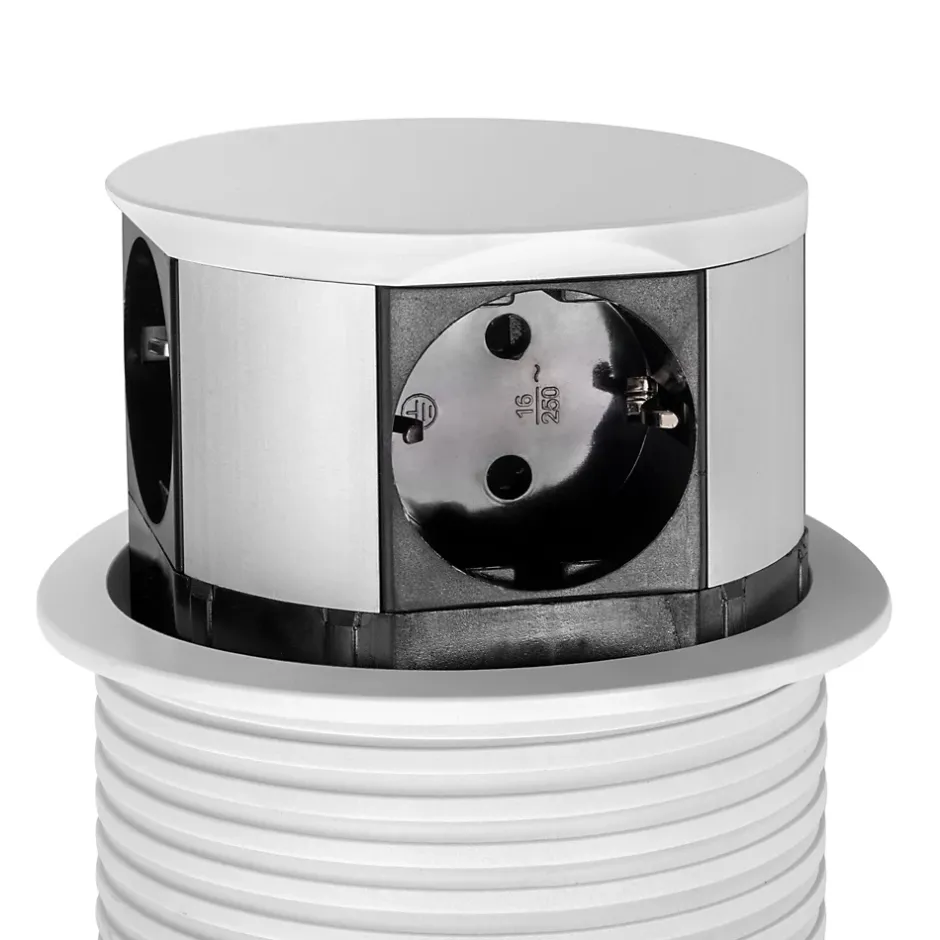 Multi-connecteur à encastrer dans les meubles de cuisine, de bureau et de maison, avec extraction simultanée des connexions par pressage.Il dispose de 3 fiches de type Schuko avec une puissance maximale autorisée allant jusqu’à 3 680 W – 16 A, destinées au marché européen de l’UE.Il dispose d’une connexion USB de type A et d’une connexion USB de type C pour recharger des appareils tels que des smartphones et des tablettes (USB A+C: 5.0V 3.4A (Max. 17.0W), USB A/C: 5.0V 3.4A (Max. 17.0W)).Pour son installation, il nécessite un usinage de 100mm de diamètre sur des surfaces d’épaisseur comprise entre 1 et 70mm, et il se fixe également au meuble sans avoir besoin d’outils grâce à un écrou de fixation manuel.Il est fabriqué en plastique et aluminium en couleur blanc, et dispose d’un câble d’alimentation de 1,5m avec une prise 230 V CA 50 Hz. VOIR LES MESURES DU PRODUIT DANS LES IMAGES. Tour multiprise Vertikal Push 100 conçue pour que les prises de courant et les connecteurs USB intégrés au meuble soient toujours accessibles grâce à sa conception rétractable pour une extraction et une dissimulation manuelles. Les connecteurs sont complètement cachés lorsqu’ils ne sont pas utilisés et se retirent simultanément en appuyant sur le dessus.Cette multiprise dispose de 3 prises de type Schuko (UE), 1 USB type A et 1 USB type C pour recharger des appareils tels que smartphones et tablettes.Son installation est très polyvalente, il ne nécessite qu’un usinage de diamètre 100mm et il peut être monté sur des surfaces très épaisses, entre 1 et 70mm. Il se fixe également au meuble sans avoir besoin d’outils grâce à un écrou de fixation manuel.Il est également fabriqué en plastique et en aluminium, et dispose d’un câble de 1,5m avec une fiche pour un fonctionnement à 230 V AC 50 Hz.