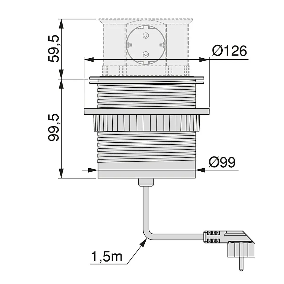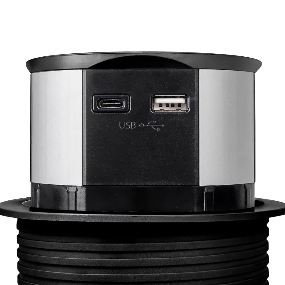 Multi-connecteur à encastrer dans les meubles de cuisine, de bureau et de maison, avec extraction simultanée des connexions par pressage.Il dispose de 3 fiches de type Schuko avec une puissance maximale autorisée allant jusqu’à 3 680 W – 16 A, destinées au marché européen de l’UE.Il dispose d’une connexion USB de type A et d’une connexion USB de type C pour recharger des appareils tels que des smartphones et des tablettes (USB A+C: 5.0V 3.4A (Max. 17.0W), USB A/C: 5.0V 3.4A (Max. 17.0W)).Pour son installation, il nécessite un usinage de 100mm de diamètre sur des surfaces d’épaisseur comprise entre 1 et 70mm, et il se fixe également au meuble sans avoir besoin d’outils grâce à un écrou de fixation manuel.Il est fabriqué en plastique et aluminium en couleur noir, et dispose d’un câble d’alimentation de 1,5m avec une prise 230 V CA 50 Hz. VOIR LES MESURES DU PRODUIT DANS LES IMAGES. Tour multiprise Vertikal Push 100 conçue pour que les prises de courant et les connecteurs USB intégrés au meuble soient toujours accessibles grâce à sa conception rétractable pour une extraction et une dissimulation manuelles. Les connecteurs sont complètement cachés lorsqu’ils ne sont pas utilisés et se retirent simultanément en appuyant sur le dessus.Cette multiprise dispose de 3 prises de type Schuko (UE), 1 USB type A et 1 USB type C pour recharger des appareils tels que smartphones et tablettes.Son installation est très polyvalente, il ne nécessite qu’un usinage de diamètre 100mm et il peut être monté sur des surfaces très épaisses, entre 1 et 70mm. Il se fixe également au meuble sans avoir besoin d’outils grâce à un écrou de fixation manuel.Il est également fabriqué en plastique et en aluminium, et dispose d’un câble de 1,5m avec une fiche pour un fonctionnement à 230 V AC 50 Hz.