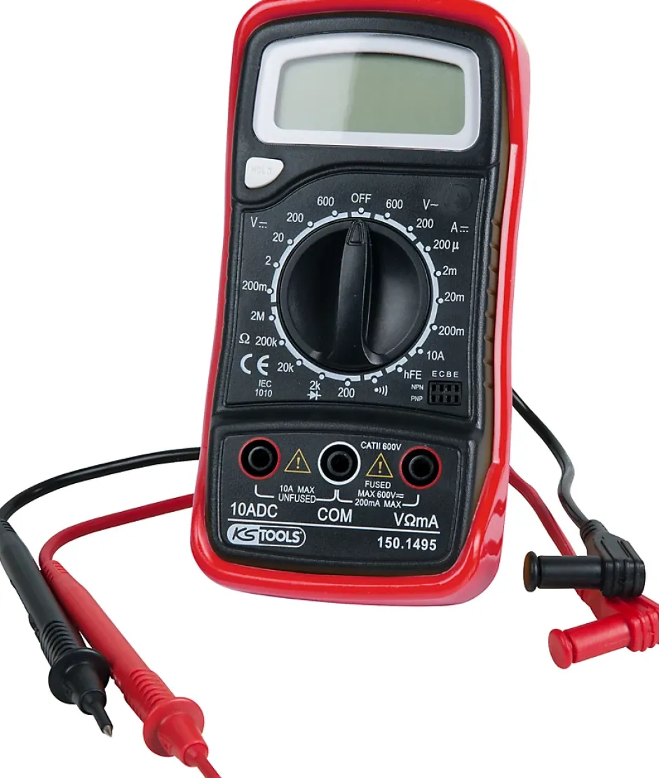 Multimètre compact avec écran LCD 3½, fonctions essentielles (tension continue et alternative, courant continu, résistance), tests diode et transistor, test de continuité sonore, fonction HOLD et pointes d’essai incluses pour des mesures rapides et fiables.