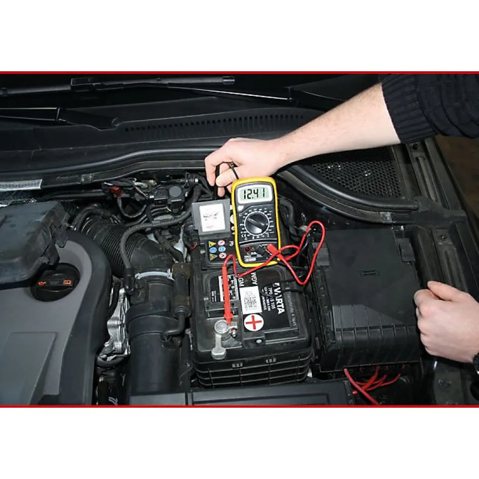 Boîtier rigide avec repose-pied intégré et grand écran LCD 3½, indicateur de batterie. Sélection des fonctions via commutateur rotatif central, mesure par pointes (rouge/noir). Fonctions prises en charge : courant continu, tension continue et alternative, résistance, testeur de diodes avec signal acoustique, testeur de transistor, test de continuité avec signal acoustique. Fonction HOLD pour sauvegarder les valeurs mesurées. Alimentation par piles (non fournies). Livré avec pointes d’essai.