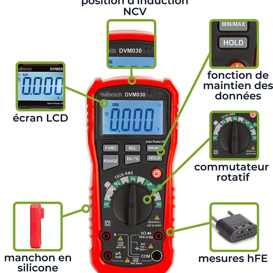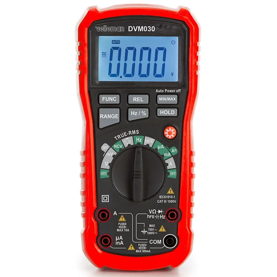 Multimètre numérique digital robuste CAT III 1000V Ce multimètre numérique est l’outil idéal pour les bricoleurs et les amateurs. Grâce à sa conception compacte et robuste, vous pouvez l’emporter partout. Ce multimètre très complet permet de mesurer la tension, le courant et la résistance à l’aide des cordons de mesure fournis (100 cm). L’appareil est doté d’une fonction True RMS qui garantit des mesures précises de la tension et du courant. En outre, le mètre est doté d’une fonction MIN/MAX et d’une fonction REL. Il dispose d’un écran rétroéclairé à 4000 points clairement lisible et d’une fonction torche pour des environnements mal éclairés. Il dispose d’un écran rétroéclairé à 1000 points qui est clairement lisible. D’une catégorie de sécurité CAT III – 500 V et une mesure de courant de 200 mA et 10 A à 600 V, vous pouvez être sûr d’une utilisation en toute sécurité. + Fonction de maintien des données: Cette fonction vous permet de conserver et lire les valeurs mesurées même après la déconnexion des cordons de mesure. Cela vous permet d’effectuer des mesures précises et fiables. + Détection de tension sans contact: Grâce à la fonction NVC, vous pouvez vérifier si une ligne ou un câble est sous tension sans avoir besoin d’une mesure par contact. + Fonction REL: La valeur initiale au début de la mesure est enregistrée comme valeur de référence (= zéro). La différence entre les dernières valeurs mesurées et la valeur de référence est affichée à l’écran. + Fonction Min/Max: Cette fonction conserve les valeurs maximales et minimales à l’écran. + Sélection de plage automatique et manuelle. + Rétroéclairage: Un grand afficheur rétroéclairé assure une bonne lisibilité même dans de mauvaises conditions d’éclairage. Spécifications : – Dimensions : 200x92x60 mm – Poids : 320 g – Matériau: ABS – Longueur du câble : 1 mètre – Dimensions de l’écran : 56×32 mm – Type d’affichage : LCD – Rétroéclairage: Oui – Affichage du nombre maximum de chiffres: 4000 – Tension CA – précision