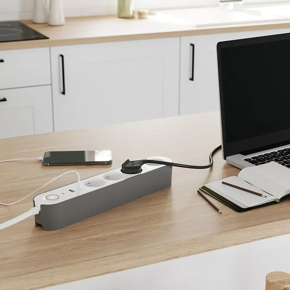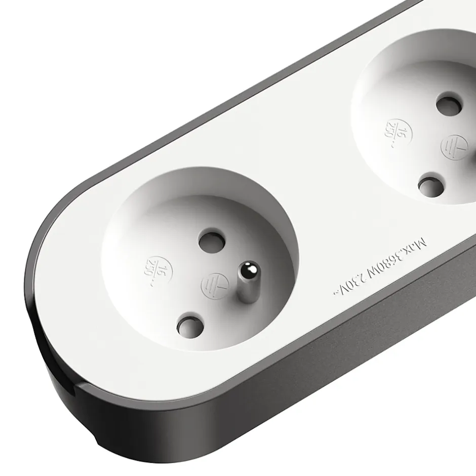 - Grâce à la protection intégrée contre les surtensions, la multiprise protège tous les appareils branchés, notamment contre les pics de tension, y compris en cas d’orage.