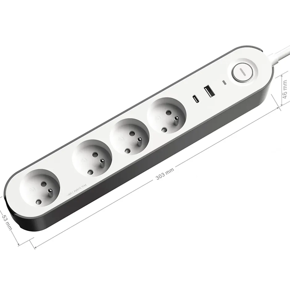 La multiprise Jacobsen 16A permet de brancher jusqu’à six appareils électriques à une seule prise murale. Elle inclut deux ports USB (a et c). Elle est dotée d’un interrupteur marche/arrêt. Avec des options de montage double, elle se fixe au mur à l’aide de vis (non fournies) ou s’utilise comme prise standard, ce qui la rend adaptée à tous types d’utilisation. De plus, grâce à la protection intégrée contre les surtensions, la multiprise protège tous les appareils branchés, notamment contre les pics de tension, y compris en cas d’orage.