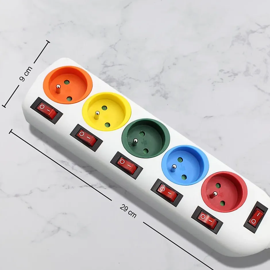 UTILISATION – Contrôlez votre consommation au plus près, avec ce bloc multiprise! Ses entrées en couleurs vous permettent de repérer plus facilement vos branchements, et ses interrupteurs situés en face de chaque sortie vous permettent de consommer plus intelligemment votre énergie !FACILE – Votre télévision et votre Home Cinéma sont branchés en même temps mais vous n’utilisez que la TV ? Pas de problème, consommez uniquement ce dont vous avez besoin, en éteignant les prises correspondant aux appareils non utilisés.INTERRUPTEUR – Les interrupteurs individuels vous permettent également d’assurer votre sécurité, en ne laissant allumés que les branchements dont vous avez besoin. Son câble de 150cm et sa forme rectangulaire vous permettent une accessibilité aisée et un rangement optimal.PRATIQUE – Les stickers de couleur du bloc multiprise vous permettent d’identifier vos câbles en un clin d’oeil. Contrôle facile et économies d’énergie au rendez-vous !CARACTERISTIQUES – Matières ABS – Normes NF – Alimentation 220-240 V, 50Hz – Ampérage: 16A maxi – Longueur câble: 150cm – Dimensions : 29 x 9 x 4 cm