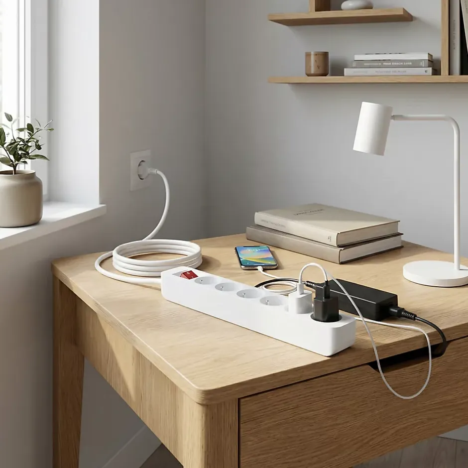 Smartphones, tablettes, ordinateurs portables, consoles de jeu, tous ces appareils ont besoin d’énergie, économisez la vôtre en les raccordant tous au même endroit ! Cette multiprise avec rallonge permet de connecter 6 appareils au moyen d’un seul équipement et d’optimiser l’espace. Avec un câble de 1 m, la distance ne pose plus aucun problème. Adaptée à une intensité de 16 A et une tension de 230 V, cette multiprise avec rallonge certifiée NF C 61-314:2008+A1:2010, PN-IEC 60884-1:2006+A1+A2+Ap1 est idéale pour une utilisation domestique et pour fournir de l’énergie à vos appareils électroniques en toute sécurité. Dotée d’un indice IP20, elle est protégée contre la pénétration de fragments et de corps étrangers de plus de 12,5 mm et se destine uniquement à un usage en intérieur. La mise à la terre vous protège contre les risques électriques (surtensions et courts-circuits), assurant la sécurité de vos appareils électriques. Avec une hauteur de 4 cm et une largeur de 4,5 cm, cette multiprise prend peu de place et s’intègre en toute discrétion partout chez vous. De couleur neutre blanc, cette multiprise avec rallonge en plastique se fond naturellement dans tous les styles, qu’ils soient classiques ou modernes. Avec la garantie de 2 ans accordée par le fabricant, vous êtes assuré de disposer d’un équipement fiable et sécuritaire. Simplifiez votre quotidien, choisissez la multiprise avec rallonge pour connecter vos équipements partout dans la maison. Faites confiance à une marque renommée et simplifiez-vous votre quotidien avec cette multiprise avec rallonge fonctionnelle.