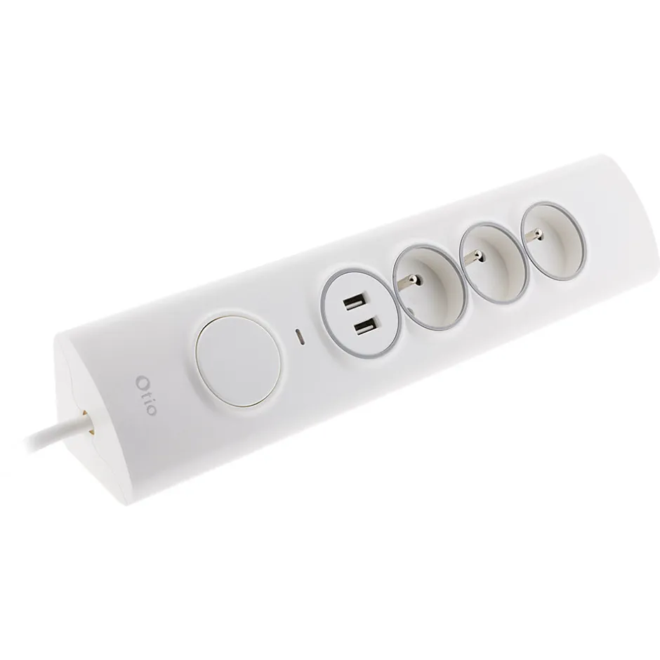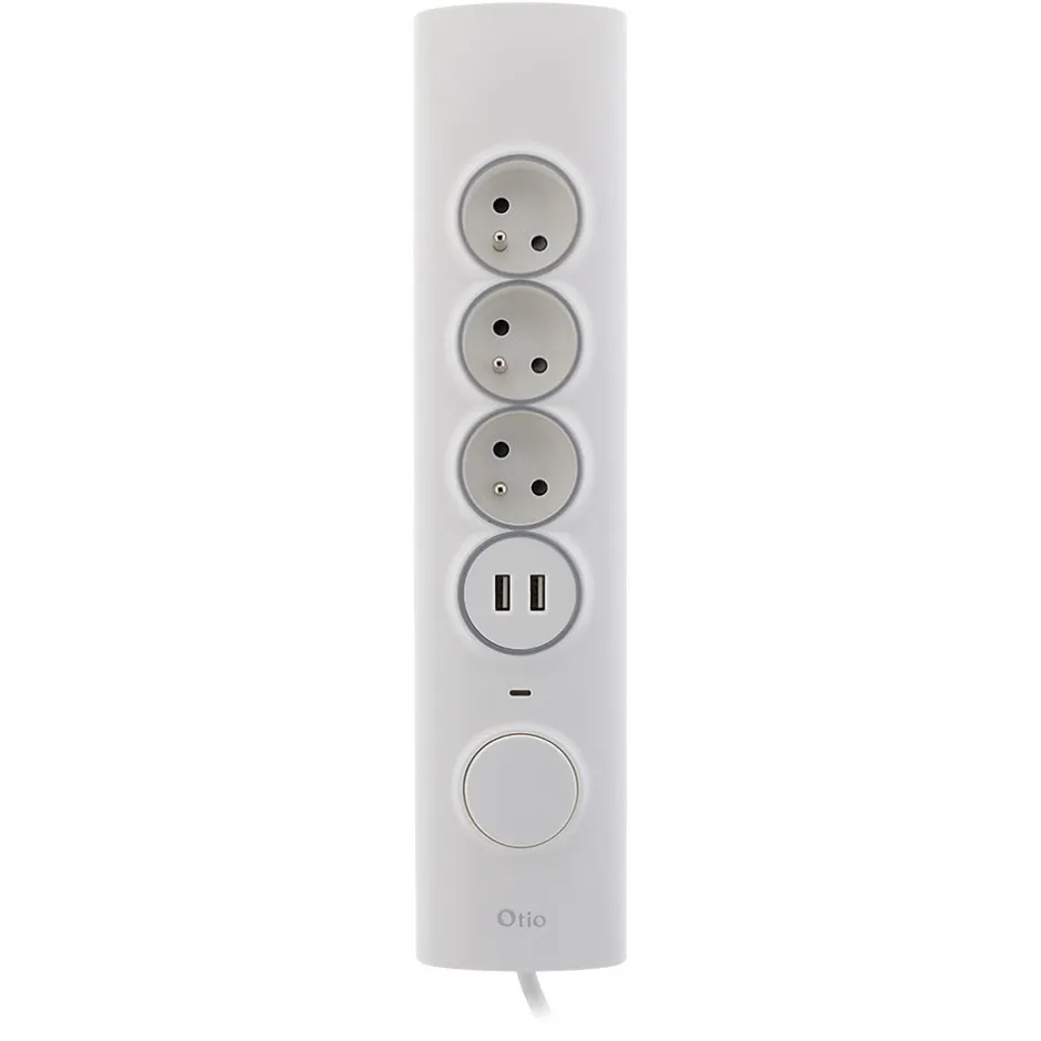 Multiprise d’angle parafoudre 4P 16A + 2 USB parafoudre précâblée – OtioCe bloc multiprise au design astucieux est idéal pour la cuisine, le bureau ou le salon. Il offre confort d’utilisation et protection pour tous les appareils électriques et multimédia contre les surtensions et la foudre.Pratique, il est muni d’une prise latérale pour brancher un chargeur sans encombrer les autres prises et de deux ports USB pour le chargement rapide de vos appareils nomades. Il est également doté d’un interrupteur qui vous permettra de réaliser des économies en éteignant tous les appareils d’un seul geste.Son installation est simple et s’effectue rapidement en fixant la multiprise grâce à sa platine arrière qui est démontable. Ce modèle est précâblé avec une fiche plate et un câble HO5VV-F 3G1mm² d’une longueur d’1,90m.Caractéristiques: 3P 16A + 1P 16A latérale en façade Version précâblée en HO5VV-F 3G1mm² Longueur du câble: 1.90 mètre Fiche plate + interrupteur Installation rapide grâce à la platine arrière démontableExiste en Option de câblage : à câbler (3415547600366), précâblé (3415547600359)