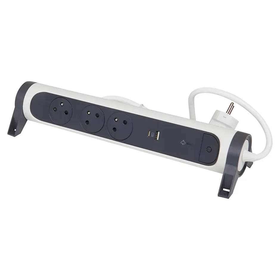 Multiprise parafoudre 3 prises + + 2 chargeurs USB-A et C Legrand blanc et gris 1.5 m