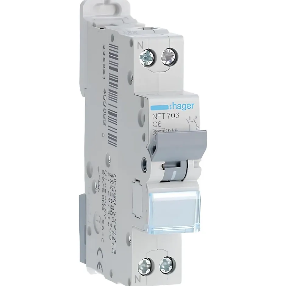 Disjoncteur Hager phase neutre à bornes décaléesCe disjoncteur 1P+N est fabriqué par Hager. Il appartient à la gamme NFT.Dans le respect de la norme EN60947-2, il assure un pouvoir de coupure de 10kA (protection des circuits électriques tertiaires et industriels). Il assure également un pouvoir de coupure de 6kA pour être conforme à la norme EN60868-1 (protection des circuits électriques résidentiels).Ce disjoncteur possède un système de connexion à bornes décalées à vis. Pensez à prévoir un peigne compatible Bornes décalées. Il occupe 1 module de 18mm sur le rail DIN de votre tableau électrique.Calibré à 6A, le disjoncteur NFT706 courbe C doit être installé sur un circuit de tension 220V.L’essentiel du disjoncteur Hager NFT706Courbe CPouvoir de coupure en habitation : 6kAPouvoir de coupure en industrie : 10kACalibrage : 6ATension nominale : 220VCertifié NF