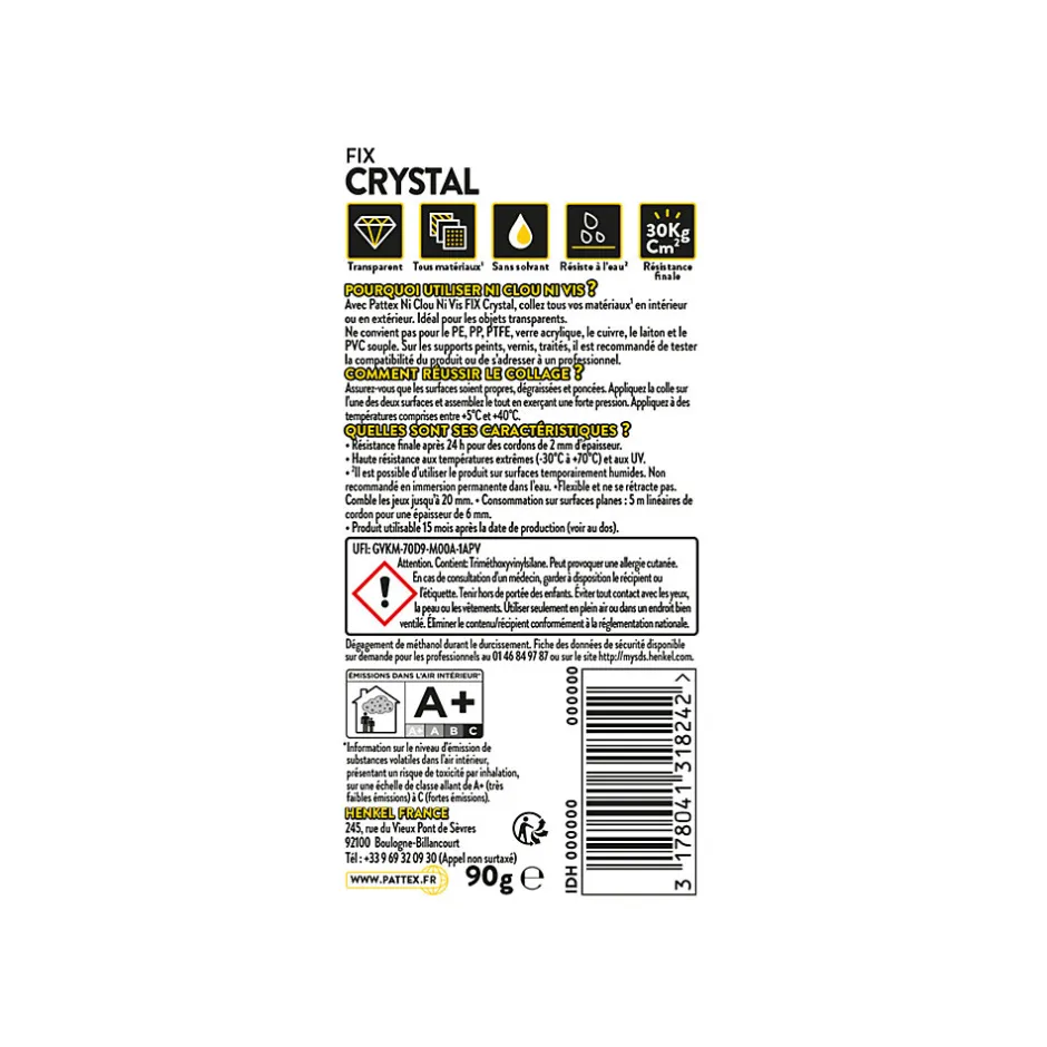 Pattex Colle de Fixation Ni Clou Ni Vis Fix Crystal offre une fixation ultra transparente pour intérieur/extérieur, sans solvant ni odeur. Sa formule polymère hybride Flextec garantit un maintien immédiat élevé sur divers matériaux tels que plastique, miroir, verre, métal, etc. Transparente, elle permet des collages esthétiques, idéaux pour le verre, parement de verre, plastique transparent, etc. Résistante aux UV, aux variations de température (-30° à +80°) et à l’humidité mais n’est pas adaptée à l’immersion totale. L’application est simple : surfaces propres, application en plots ou cordons avec un pistolet extrudeur, pression forte pendant 15sec, repositionnement possible pendant 15min, résistance finale en 24 heures. La formule sans solvant et sans isocyanate la rend non irritante pour la peau. Caractéristiques : résistance finale extra forte, efficacité sur tous les matériaux sauf PE, PP, PTFE, verre acrylique, cuivre, laiton et PVC souple.