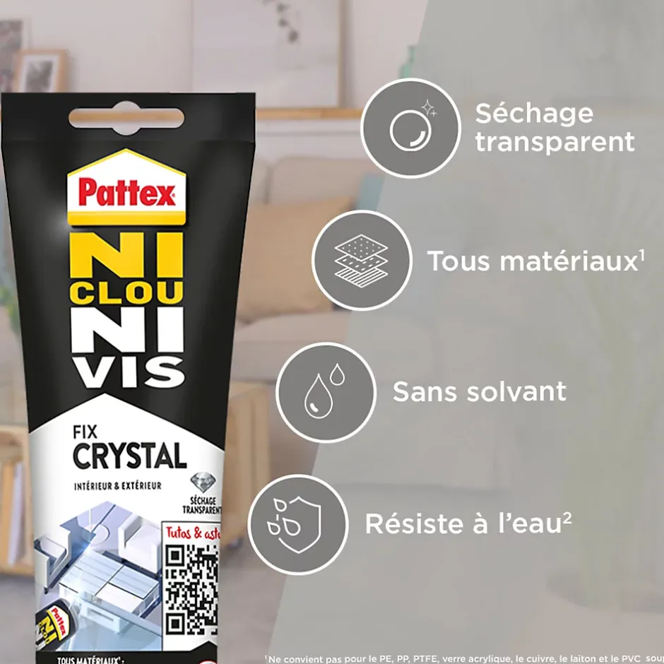 - Emballage | Pattex Ni Clou Ni Vis Tous Matériaux Crystal, colle ultra forte dotée de la technologie Flextec, colle transparente multi-matériaux, Cartouche 290 g. 1 cartouche = 15m de cordons environ.