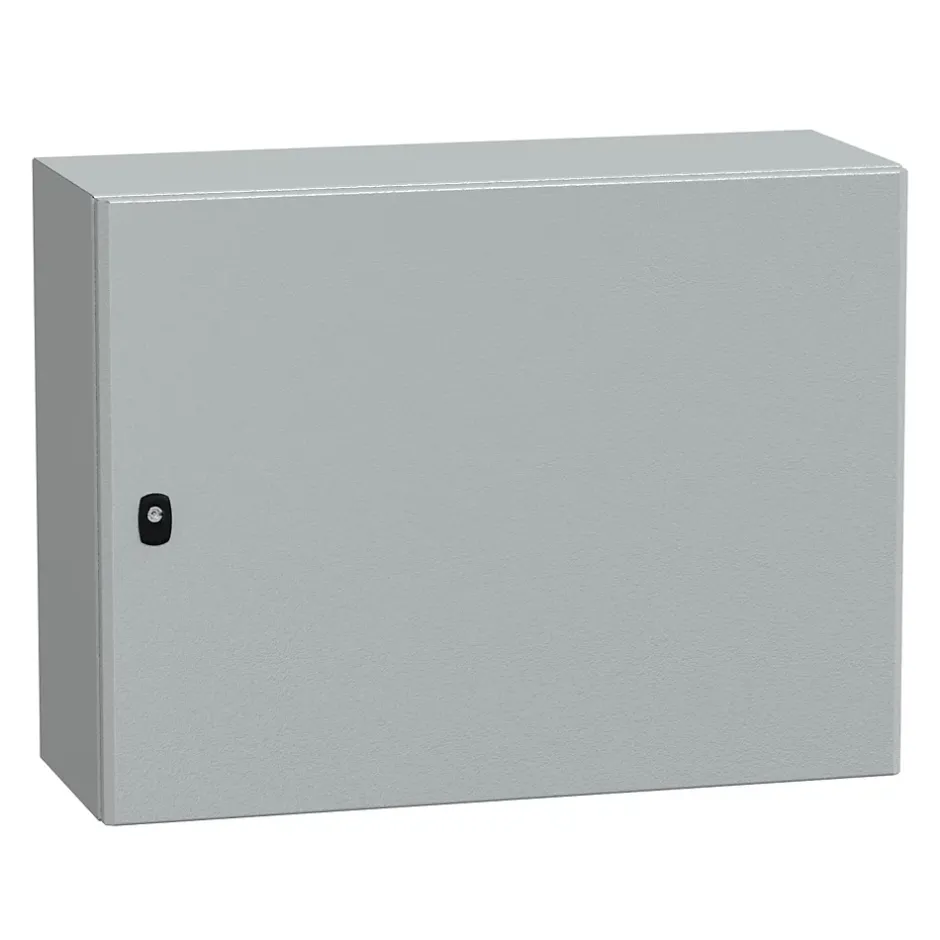 Coffret acier laminé – HxLxP : 600 x 800 x 300mm – avec plaque passe-câblesCe coffret métal est étanche IP66, c’est-à-dire qu’il résiste aux jets d’eau puissants. Cette armoire électrique très robuste résiste aux chocs IK10 .Ce coffret métallique étanche est issu de la gamme Spacial S3D. Il est livré avec avec une plaque passe-câbles à percer pour y intégrer des presses étoupes. Il est également possible d’installer une plaque passe-câbles avec entrée souple sans perçage disponible en accessoireL’armoire NSYS3D6830P est équipée de 1 porte pleine verrouillée par 1 serrure avec fermeture 3 points à empreinte double panneton. Possibilité de remplacer par serrure à clé, disponible en optionLes points clés du coffret S3D Schneider NSYS3D6830PPattes de fixation NSYAEFPFSC à commander séparémentPlaque galva pleine fournieBarrette de terre disponible en accessoireMontage : mural; sur poteau; sur pied; sur socle