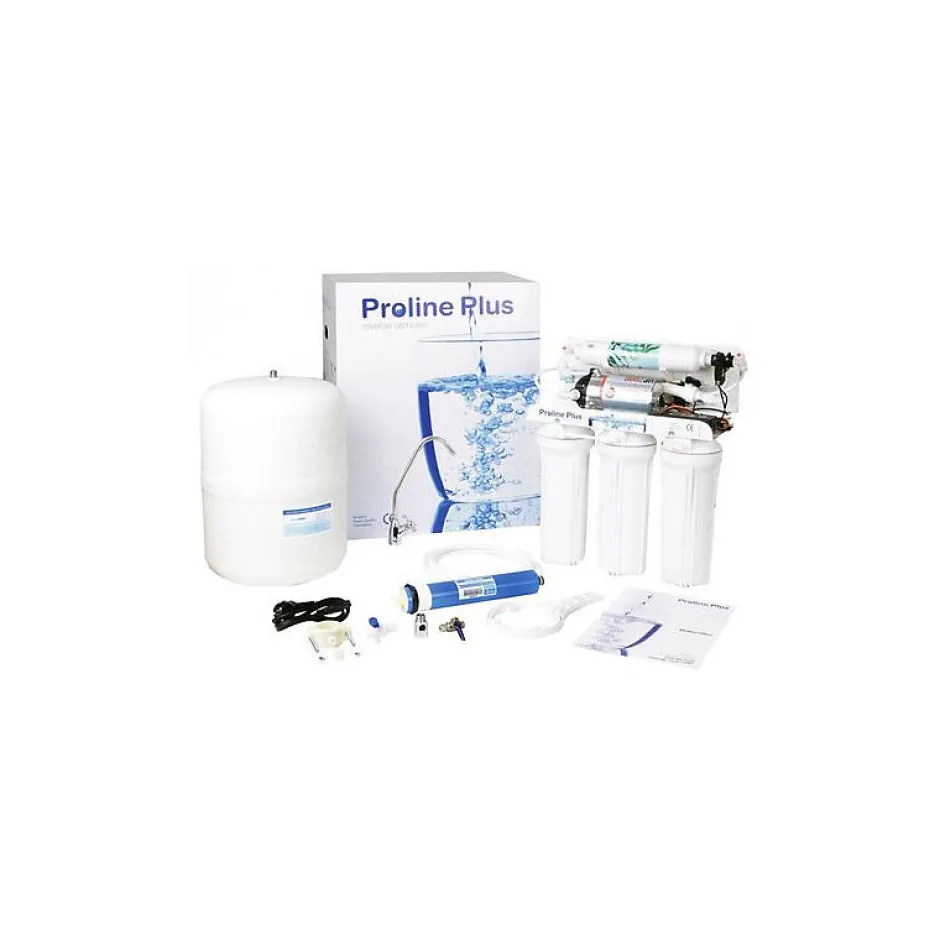 Osmoseur 5 étapes Proline avec pompeSystème complet de traitement de l’eau du robinet.Elimine les sels minéraux, les mauvais goûts et odeurs, les pesticides, herbicides, virus et polluants chimiques.Version pompe booster conseillée pour les pressions de service Comprendspompe,réservoir (pour le stockage d’eau qui a été purifiée),cartouches,membrane 50 GPD,robinet,accessoires de connexion,guide d’installation.Caractéristiques :Alimentation électrique : 445Nettoyage de la membrane : ManuelNombre et capacité de la membrane d’osmose inverse : 1 membrane – 50 GPDCapacité de stockage du ballon : 16L (l 280 mm x H 420 mm)Temps de remplissage : 2 heuresDimensions : H 540mm x L 440mm x P 330mmPression d’arrivée d’eau admissible : 2,5 – 6 barsTempérature d’eau admissible : 2 – 40°CTDS d’entrée maximum : 2000 ppmÉlimination des TDS : 95% (+/- 1,5%)Dureté de l’eau maximum : 25° françaispH admissible : 4 – 11Production d’eau maximum : 175 litres / jour