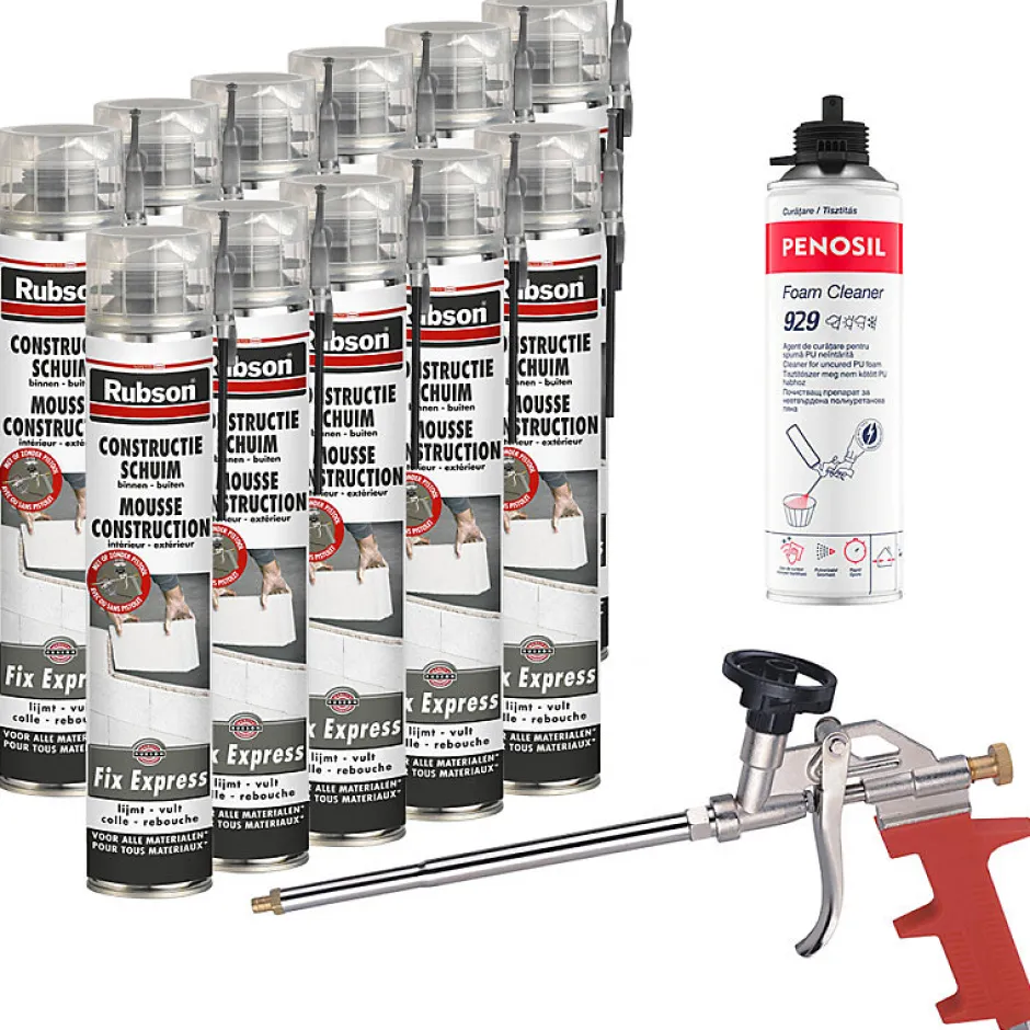 Le pack RUBSON Fix Express regroupe l’essentiel pour vos travaux de montage, collage et isolation :- 11 cartouches de mousse expansive RUBSON Construction Fix Express 750 ml ,- 1 nettoyant mousse polyuréthane Penosil Foam Cleaner 929 500 ml ,- 1 pistolet manuel Fischer Darex pour une application précise et maîtrisée.Ce kit complet professionnel est idéal pour les artisans du bâtiment, les menuisiers, les plaquistes, les poseurs et les bricoleurs exigeants souhaitant disposer de tout le matériel nécessaire pour un travail rapide, propre et efficace.• Mousse de construction RUBSON Fix Express 750 ml – Ivoire Fixation, montage et pose multi-matériaux La Mousse Construction Fix Express RUBSON est une mousse expansive polyuréthane mono-composante à faible expansion , spécialement conçue pour la fixation et le montage d’éléments de construction .Polyvalente et performante, elle offre une adhérence exceptionnelle sur de nombreux matériaux : bois, béton, brique, pierre, métal, PVC rigide, plaques de plâtre, panneaux de ciment, isolants, MDF, etc.✔ Expansion faible : ne déforme pas les matériaux collés✔ Prise rapide : sèche en surface dès 10 minutes✔ Durcissement complet : en 1 heure minimum✔ Utilisable en intérieur et extérieur ✔ Peut être coupée, poncée et peinte après séchage✔ Compatible avec ou sans pistolet Idéale pour le montage de cloisons non porteuses, la pose de panneaux isolants ou le collage d’éléments décoratifs (briques, parements, carrelages, métaux…), elle combine rapidité, efficacité et propr