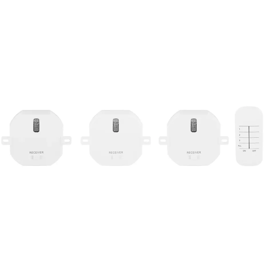 Cet ensemble vous offre la possibilité de contrôler facilement vos plafonniers à l’aide d’une télécommande. L’ensemble comprend une télécommande à 3 canaux ainsi que 3 interrupteurs encastrables Active les luminaires et les appareils jusqu’à 1000W. Compatible avec la gamme Basic