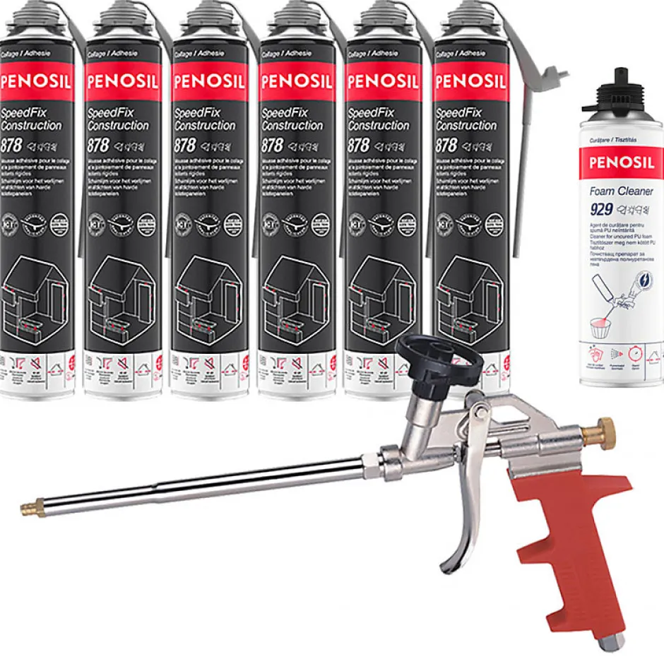 Pack contentant :- 6 Mousses colle universelle SpeedFix Construction 878 pistolable 690ml PENOSIL- 1 Nettoyant mousse polyuréthane Foam Cleaner 929 pistolable 500ml PENOSIL- 1 Pistolet manuel pour mousse expansive ○ Mousses colle universelle SpeedFix Construction 878 pistolable 690ml PENOSIL Mousse colle universelle pour divers travaux de construction à l’intérieur et à l’extérieur. Utilisable en toutes saisons, elle garantit de bons résultats à des températures allant de -5°C à +30°C. La mousse colle possède d’excellentes propriétés de collage et d’isolation thermique, une faible pression de séchage et une faible post-expansion.- Excellentes propriétés de collage.- Convient à une utilisation en toute saison, de -5°C à +30°C.- Faible pression au séchage et faible post-expansion.- Pour l’isolation thermique et acoustique.- Remplissage et isolation des joints étroits.- Isolation thermique 0,034 W/m·K- Empêche les ponts thermiques- Isolation phonique 62dBDomaines d’application :- Fixation de panneaux d’isolation sur les façades et les fondations.- Fixation de panneaux d’aménagement intérieur.- Fixation d’appuis de fenêtre.- Collage de blocs de construction rectifiés.- Réduction de l’impact des ponts thermiquesAdhère sur :○ Polystyrène○ Plaques de plâtre○ Panneaux OSB○ Panneaux agglomérés○ Bois○ Béton○ Pierre○ Métal○ PVC○ Couleur : Gris○ Aérosol pistolable de 690ml△ N’adhère pas aux surfaces en téflon, en polyéthylène et en silicone. Une fois durcie, sensible aux UV et à la lumière directe du soleil et doit donc être recouverte d’un matériau opaque approprié. *Information sur le niveau d’émission de substances volatiles dans l’air intérieur; présentant un risque de toxicité par inhalation, sur une échelle de classe allant de A+ (