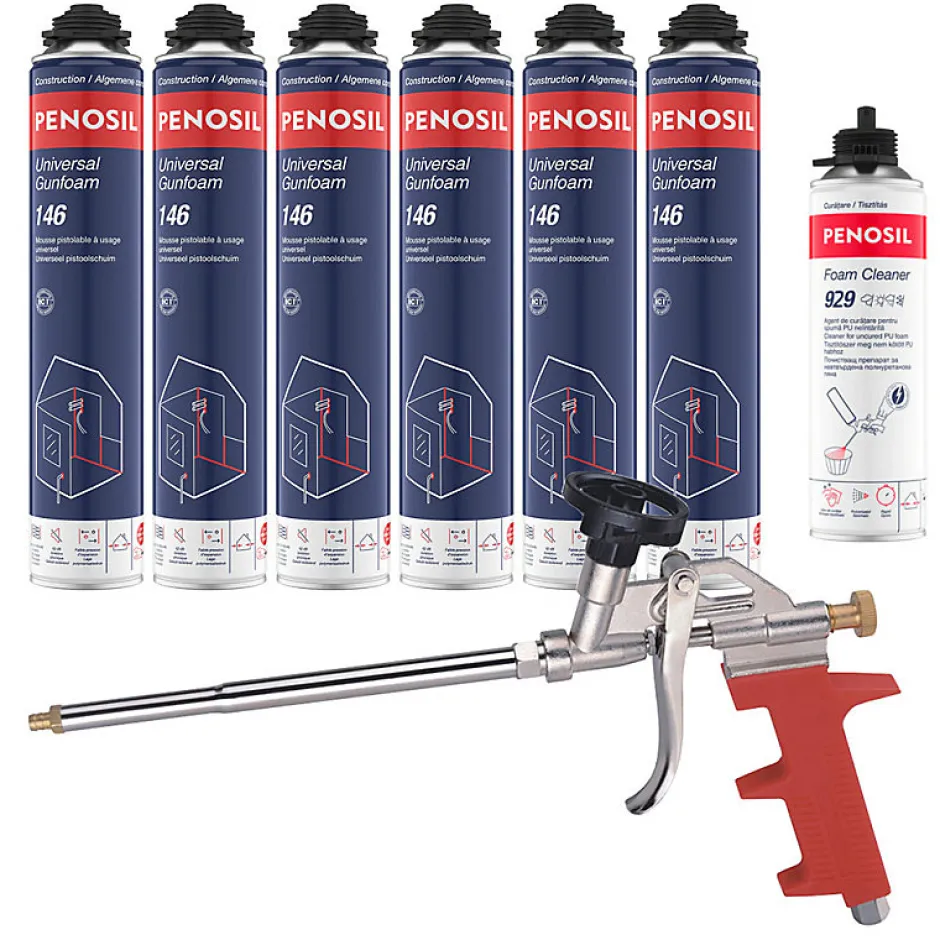 Pack contentant :- 6 Mousses polyuréthanes Universal Gunfoam 146 pistolable 690ml PENOSIL- 1 Nettoyant mousse polyuréthane Foam Cleaner 929 pistolable 500ml PENOSIL- 1 Pistolet manuel pour mousse expansive ○ Mousses polyuréthanes Universal Gunfoam 146 pistolable 690ml PENOSIL Mousse universelle de polyuréthane monocomposante prête à l’emploi pour diverses applications dans le bâtiment, par exemple le remplissage et l’étanchéité des joints et des pénétrations, l’isolation thermique et acoustique. Adhère bien à la plupart des matériaux comme le bois, le béton, la pierre, le plâtre, le métal, le PVC et le polystyrène.- Bonnes propriétés de remplissage- Pas de retrait- Faible pression de durcissement- Coefficient d’isolation thermique et acoustique élevéDomaines d’application :- Remplissage des cavités et des interstices- Isolation des pénétrations- Étanchéité et remplissage des joints et cavités- Réduction de l’impact des ponts thermiques- Isolation thermique et acoustique○ Couleur : Beige○ Aérosol pistolable de 690ml△ N’adhère pas aux surfaces en polyéthylène (PE), PTFE (Teflon) ou silicone. *Information sur le niveau d’émission de substances volatiles dans l’air intérieur; présentant un risque de toxicité par inhalation, sur une échelle de classe allant de A+ (très faibles émissions) à C (fortes émissions) → A+ : Très faibles émissions ○ Nettoyant mousse polyuréthane Foam Cleaner 929 pistolable 500ml PENOSIL Nettoyant en spray pour l’élimination de la mousse PU non durcie sur les outils et les surfaces.- Effet immédiat- Nettoyage efficace- Utilisation avec le bouchon de pulvérisation ou un pistolet mousse PUDomaines d’application :- Nettoyage de l’intérieur et de l’extérieur du pistolet mousse après utilisation<b