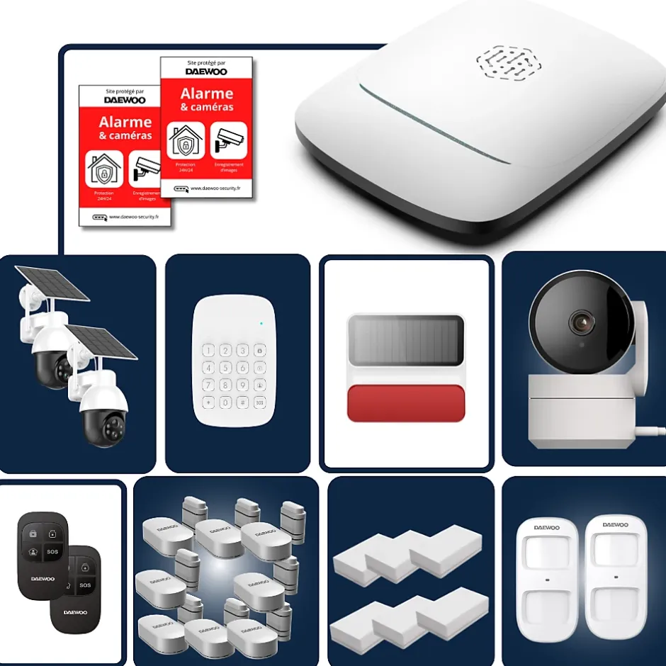 ️ Pack Alarme & Vidéo « Tranquillité+ » – La Protection TotaleLe Pack Tranquillité+ est la solution ultime pour sécuriser les grandes propriétés et résidences secondaires. Articulé autour de la centrale hybride Elite PA501Z, ce système offre une couverture massive avec 14 capteurs et une vidéosurveillance autonome, sans aucun abonnement. Les Points Forts du SystèmeCentrale Connectée Elite PA501Z : Fiabilité maximale grâce à sa double connexion RJ45 + Wi-Fi. En cas de coupure internet, le relais 4G (SIM en option) prend le relais en conservant le contrôle total sur l’application. Elle inclut un Hub Zigbee 3.0 économe et une batterie de secours (12h).Vidéosurveillance Intelligente :Extérieur : 2 caméras motorisées (3MP) avec panneaux solaires pour une autonomie totale, sans aucun câblage.Intérieur : 1 caméra 360° équipée d’un cache vie privée physique qui se ferme à votre retour.Une Forteresse Périmétrique : 8 détecteurs d’ouverture et 6 détecteurs de vibration pour anticiper les effractions et déclencher l’alarme au premier coup sur une vitre, avant même l’intrusion.Dissuasion & Volume : 1 sirène extérieure solaire surpuissante (flash/son) et 2 détecteurs de mouvement intérieurs (compatibles avec les animaux de moins de 12kg).Contrôle Facilité : Armez/désarmez le système via le clavier mural sans fil à l’entrée ou avec les 2 télécommandes fournies (dotées d’un bouton SOS). L’Expérience DaewooApplication Unique : Pilotez vos caméras et votre alarme gratuitement depuis l’application « Daewoo Home Connect ».Zéro Frais Caché : Aucun abonnement requis (stockage sur carte SD non fournie ou Cloud optionnel).Installation Plug & Play : Pose facile sans travaux, avec assistance technique basée en France.